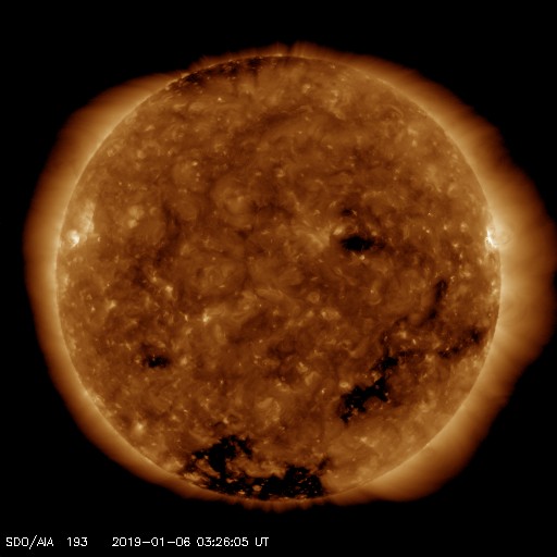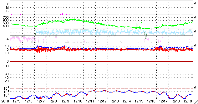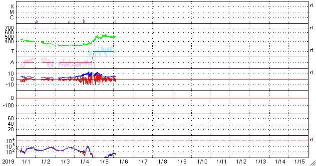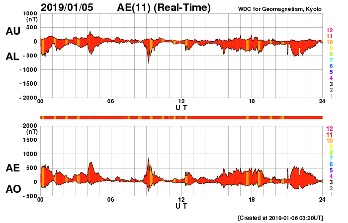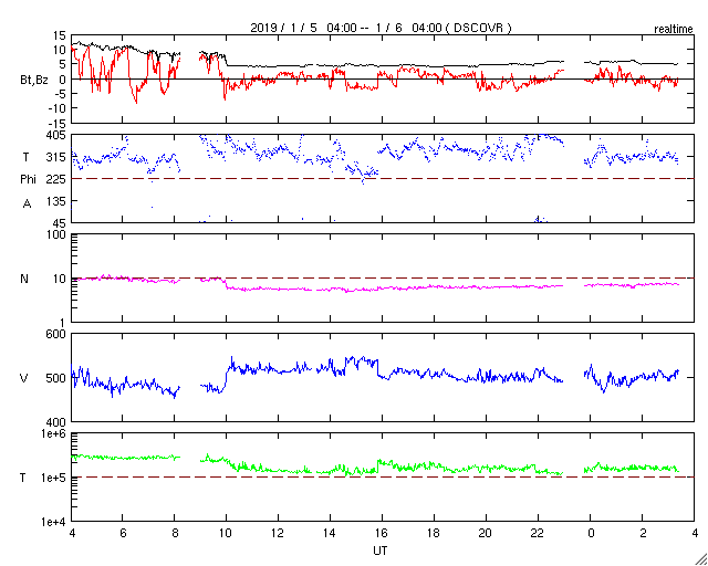 2019/ 1/ 6 12:36 更新 500km/秒の高速太陽風が続き、磁気圏も活動的です。 担当 篠原 昨日のニュース以降、 太陽風は500km/秒の高速状態が続いています。 磁場強度は昨夜にかけて5nTと平均的な値に下がり、 以降、安定しています。 磁場の南北成分は、 磁場が強まっていた頃はやや大きく変化していたのですが、 磁場強度が5nTに下がった後は、振れ幅が小さくなっています。 磁気圏では小中規模の活動が続いていて、 AE指数は500nT前後の変化が頻繁に発生しています。 27日周期の図を見ると、 前周期は12月10日に速度のピークを迎えて、 その後は次第に低下しています。 今回、高速風の始まりは2日ほど遅れましたが、 後半の推移はどうなるでしょうか。 前周期の様子とも比べながら注目してください。 太陽では、2732黒点群が西の端に近付いています。 一方、東端に磁場の強まりが現れています (SDO衛星AIA193で小さく光っている領域)。 ここに黒点が現れなければ、太陽は無黒点になりそうです。