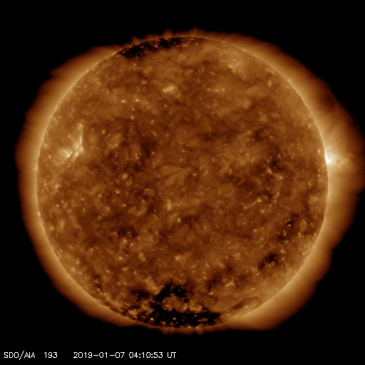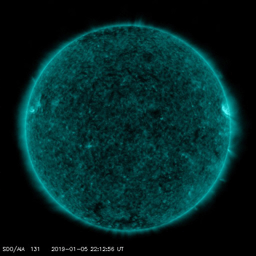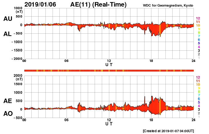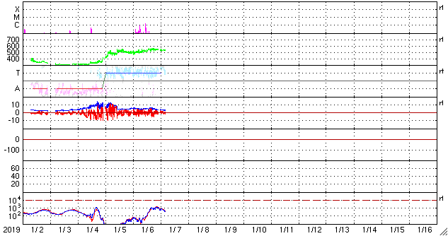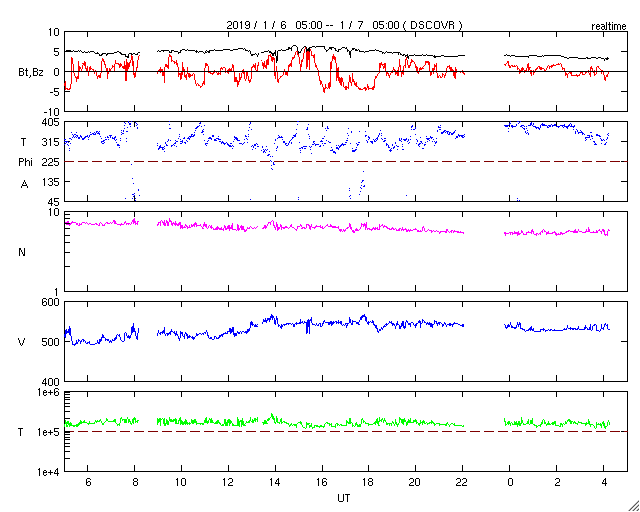 2019/ 1/ 7 13:27 更新 半年ぶりにCクラスの小規模フレアが発生しました。高速の太陽風が続いています。 担当 篠原 昨夜、6日19時半(世界時6日10時半)に、 太陽の西の端近くの2732黒点群で、 C1.6の小規模フレアが発生しました。 SDO衛星AIA131による動画を掲載します。 Cクラスに達するフレアの発生は、 2018年7月6日(世界時)に発生した同じC1.6のフレア以来で、 半年ぶりのことです。 2732群は昨日の昼頃から活動がやや活発になって、 B3.1やB8.6の小さいフレアを起こす様になり、 その後、C1.6のフレアが発生しました。 2732群は太陽の端に没して、既に見えなくなっています。 この後の変化を確認できないのは残念です。 現在の太陽は無黒点です。 太陽風は、速度が500km/秒から530km/秒へ 更に高まっています。 最高速度のタイミングも前周期より遅れて到来した様です。 太陽風の磁場強度は5nTから3nTへ下がり、 やや弱くなっています。 高速太陽風は次第に弱まっていきそうです。 太陽風磁場の南北成分は、南向きの変化も発生していますが、 全体としては、0nT付近かやや北寄りになっています。 磁気圏の活動も、全体としては昨日より小さくなっていて、 磁場が南向きになった頃に、 AE指数800nTの中規模の変化が発生した程度です。