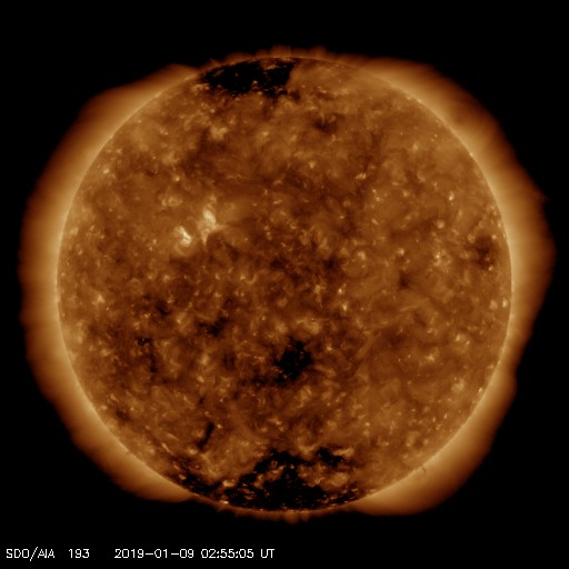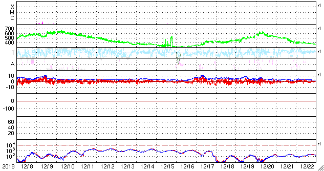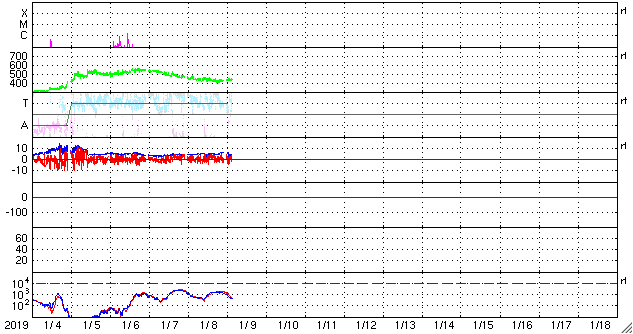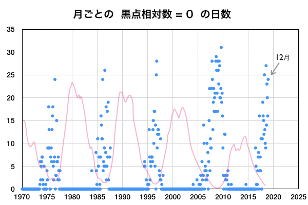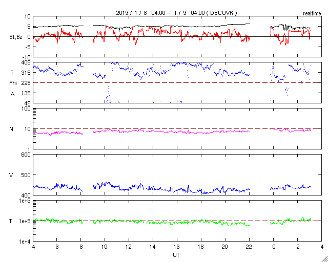 2019/ 1/ 9 12:11 更新 太陽風は平均的な状態です。12月の黒点数は 3.1 でした。 担当 篠原 WDC-SILSOより、 12月の黒点相対数の月平均値は、 3.1 と発表されています。 2018年7月以降、1桁台が6か月続いています。 また、月平均値が1桁台に初めて下がったのは 2017年11月でしたが、 それからの14か月のうち、11か月で1桁台を記録しています。 1枚目の黒点数のグラフでは、右端(最新)のところに、 低い値のかたまりができています。 無黒点日の日数は24日と、 今回の極小期で5回目の20日台になっています。 前の極小期では、2008〜2009年頃のグラフの様に、 ここから更に黒点数の低下が見られました。 今回も同様の変化になるのか、 この辺りで次の周期に切り替わるのか、 2019年の太陽の変化に注目してください。 太陽風の速度は、430km/秒前後で安定し、 平均的な状態になっています。 磁場強度も、5nTと平均的な値です。 磁気圏は穏やかになっていて、 AE指数は、小さい変化も起きていますが、 全体としては変化の少ない状態です。 太陽は無黒点です。 ![]() 太陽黒点相対数の長期変化。12月の黒点相対数は 3.1 でした。 (c) 黒点データ:WDC-SILSO、作図:宇宙天気ニュース ![]() 1970年以降の太陽黒点相対数の長期変化。 (c) 黒点データ:WDC-SILSO、作図:宇宙天気ニュース ![]() 1970年以降の月毎の無黒点日の日数。 (c) 黒点データ:WDC-SILSO、作図:宇宙天気ニュース ![]() SDO衛星のAIA193カメラによる太陽コロナの様子 (c) SDO (NASA) ![]() SDO衛星による太陽の可視光写真 (c) SDO (NASA) ![]() DSCOVRが観測した太陽風の磁場(1番上の枠、黒線は全体の強度、赤線は南北成分) および、太陽風の密度(3番目の紫線)、速度(4番目の青線) (c) データ:NOAA/SWPC、作図:宇宙天気ニュース ![]() AE指数(速報値) 下段のAEグラフの値が高くなると、オーロラ活動が活発化しています。 (c) 京都大学WDC ![]() ![]() 27日の太陽周期に合わせたデータプロット 太陽が同じ面を地球に向けていた27日前の変化から、今後を予想することができます。 (c) 作図:宇宙天気ニュース