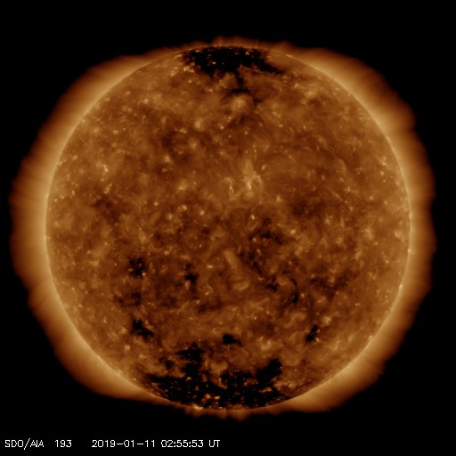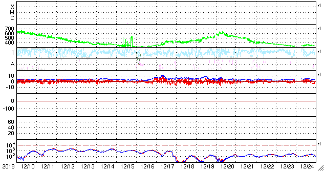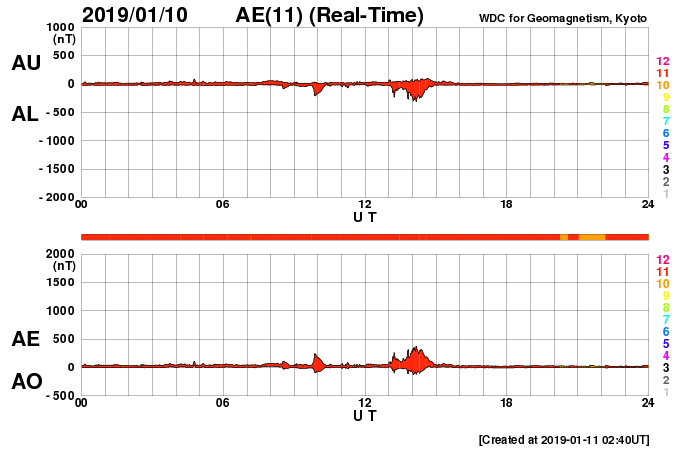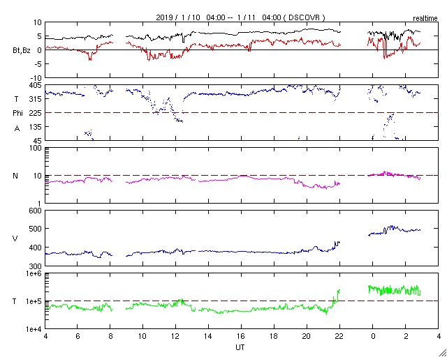 2019/ 1/11 12:01 更新 太陽風の速度が500km/秒に高まっています。磁気圏は穏やかです。 担当 篠原 昨夜から今朝にかけて、 太陽風の磁場強度が3nTから7nTへ、 小幅ですが強まる変化が到来しています。 続く様に、今朝くらいから速度も上昇を始め、 現在、500km/秒と高速の状態に達しています。 SDO衛星AIA193の太陽の南側に見える コロナホールの影響が始まったのかもしれません。 27日周期の図を見ると、 前周期の今頃(12月15日)は、低速の風が続いていて、 今回は様子が変わっています。 この後、太陽風はどの様に推移するでしょうか。 太陽風磁場の南北成分は、北寄りになっています。 このため、磁気圏は穏やかで、 AE指数はほとんど変化のない状態です。 太陽風の速度が高まっているので、磁場が南寄りに変わると、 磁気圏の活動も高まってくるでしょう。 太陽は無黒点で、穏やかです。