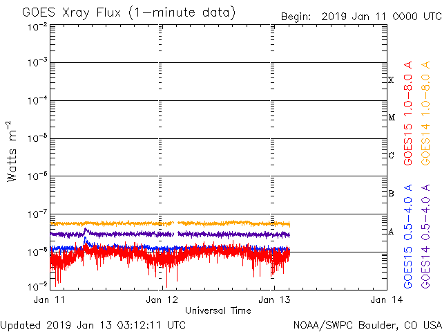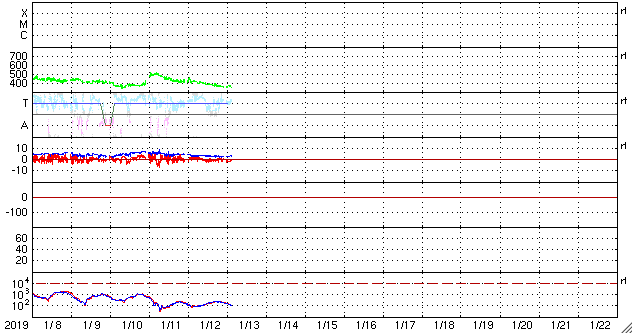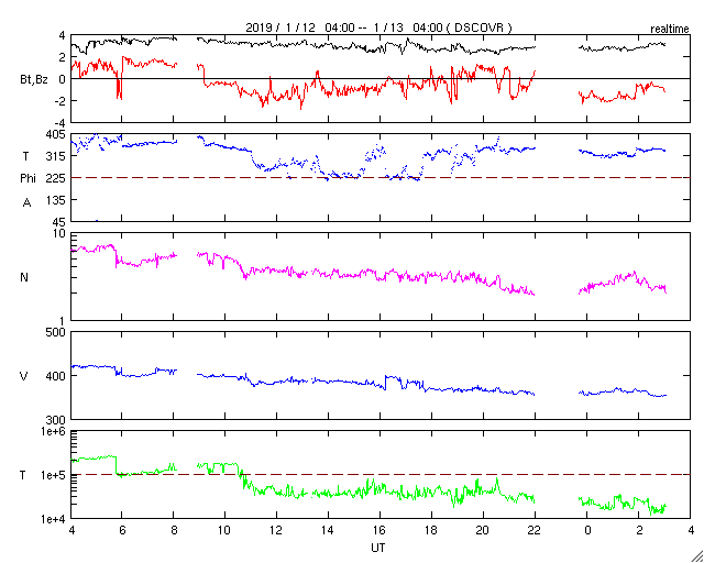 - 2019/ 1/12 12:31 太陽風は平均的な速さに戻っています。磁気圏は穏やかです。