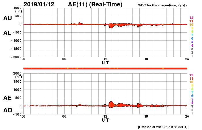 下段のAEグラフの値が高くなると、オーロラ活動が活発化しています。