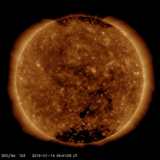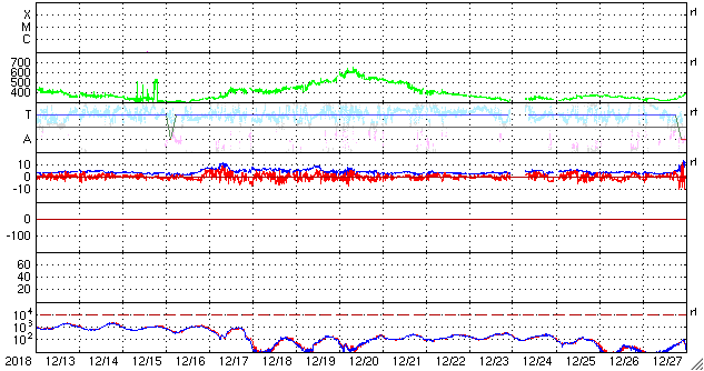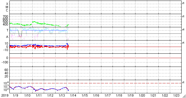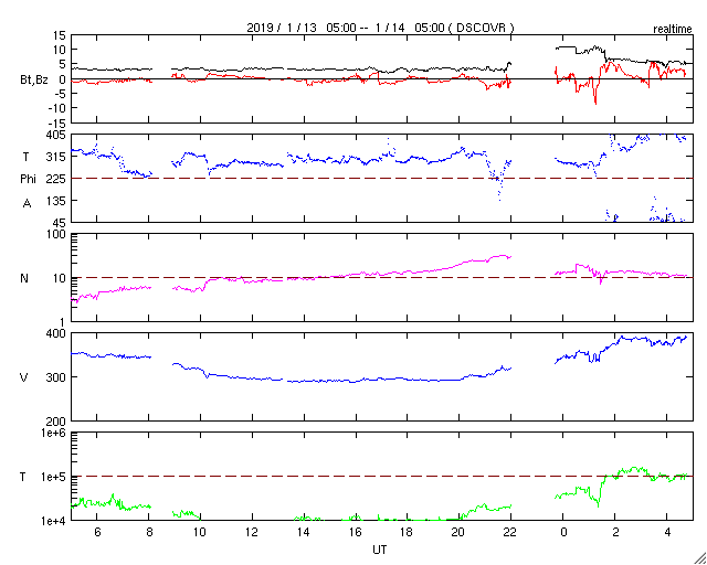 2019/ 1/14 13:55 更新 太陽風は低速から平均的な速さに戻りかけています。更に高まる可能性があります。 担当 篠原 太陽風の速度は、昨夜にかけて300km/秒まで下がりましたが、 その後上がり始めて、 現在は380km/秒と平均的な速さに戻りかけています。 27日周期の図の前周期に見られた太陽風速度の高まりが、 回帰してきたのかもしれません。 太陽風の磁場強度は、 一時的に10nTに強まる変化が発生していますが、 現在は5nTと平均的な状態です。 南北成分は、0nT付近で小さく変化しています。 速度が低かったこともあり、磁気圏は穏やかで、 AE指数は小さい変化が見られる程度です。 前周期の太陽風は、 12月20日に600km/秒まで速度が高まりました。 今回も同様の高まりになるでしょうか。 今後の推移に注目してください。 太陽は無黒点で穏やかです。 ![]() SDO衛星のAIA193カメラによる太陽コロナの様子 (c) SDO (NASA) ![]() SDO衛星による太陽の可視光写真 (c) SDO (NASA) ![]() DSCOVRが観測した太陽風の磁場(1番上の枠、黒線は全体の強度、赤線は南北成分) および、太陽風の密度(3番目の紫線)、速度(4番目の青線) (c) データ:NOAA/SWPC、作図:宇宙天気ニュース ![]() AE指数(速報値) 下段のAEグラフの値が高くなると、オーロラ活動が活発化しています。 (c) 京都大学WDC ![]() ![]() 27日の太陽周期に合わせたデータプロット 太陽が同じ面を地球に向けていた27日前の変化から、今後を予想することができます。 (c) 作図:宇宙天気ニュース