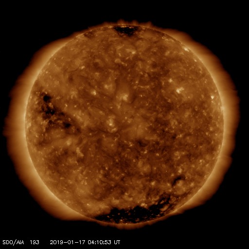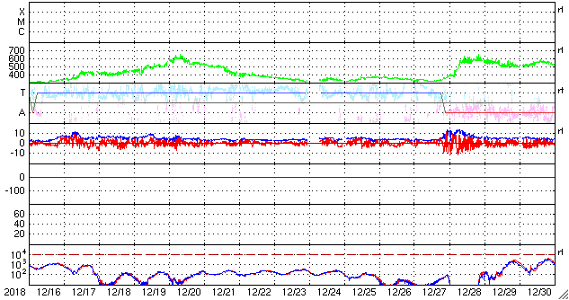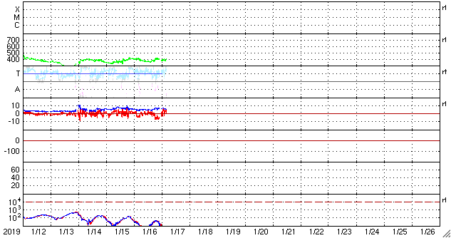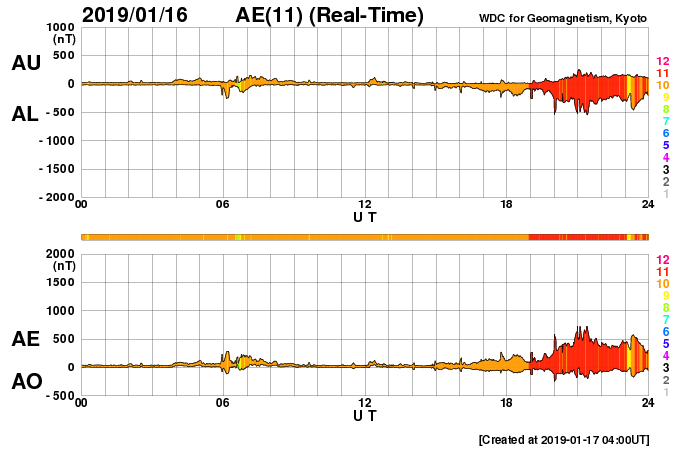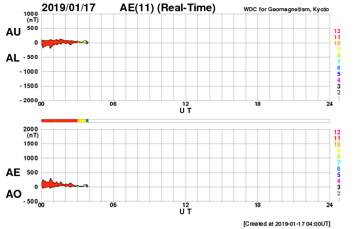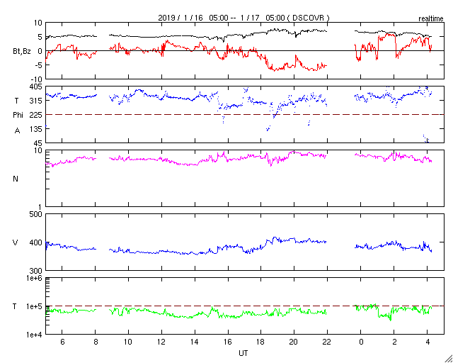 2019/ 1/17 13:24 更新 穏やかな太陽風が続いています。太陽は無黒点です。 担当 篠原 太陽風の速度は、 400km/秒と370km/秒の間をゆっくりと変化して、 平均的か、やや低速くらいの状態を保っています。 磁場強度は、5nTから7nTへ少し上がる変化をしています。 磁場の南北成分は、 グラフの前半は0nT付近になっていますが、 後半に、南向きに -5nTと少し大きく変化した時間帯があります。 ここで磁気圏の活動が高まって、 AE指数で700nTに達する中規模の変化を起こしています。 その後、磁場は北向きに切り替わり、 磁気圏も静かになっています。 27日周期の図を見ると、 前周期の太陽風速度の高まりの期間を、 目立った変化のないまま通り過ぎようとしています。 この後、太陽風は低速になっていきそうです。 太陽は、無黒点が続き、 穏やかです。