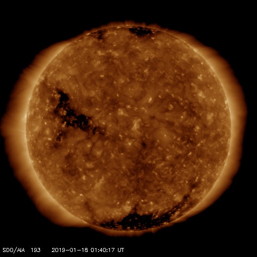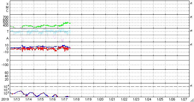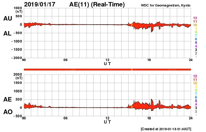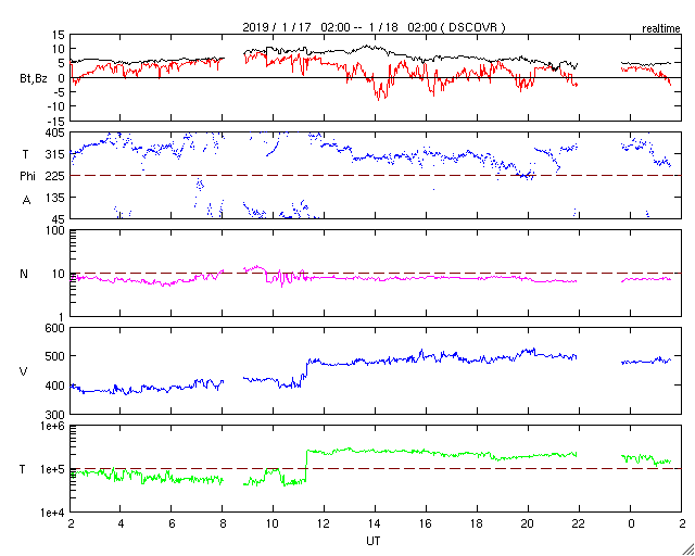 2019/ 1/18 10:48 更新 太陽風の速度がやや高速になっています。 担当 篠原 太陽風の速度が高まっています。 昨夜、17日20時(世界時17日11時)頃までは、 400km/秒付近で安定していたのですが、 その後、急に470km/秒へ高まる変化が到来し、 現在まで、470〜500km/秒とやや高速の状態になっています。 太陽風の磁場強度は、 5nTから10nTへ高まり、 再び5nTに戻る変化になっています。 磁場の強まりは一段落しているので、 速度の高まりもこのくらいで留まるのでしょうか。 27日周期の図を見ると、 前周期の速度の高まりからは、 だいぶ遅れて変化が発生しました。 今後の推移はどうなるでしょうか。 注目してください。 太陽風磁場の南北成分は、 グラフの前半は北寄りですが、 速度が高まった頃から、南北に変化する様になっています。 磁気圏では小規模の活動が起きていて、 AE指数は、300〜500nTの変化が発生しています。 太陽は、無黒点で穏やかです。