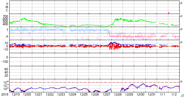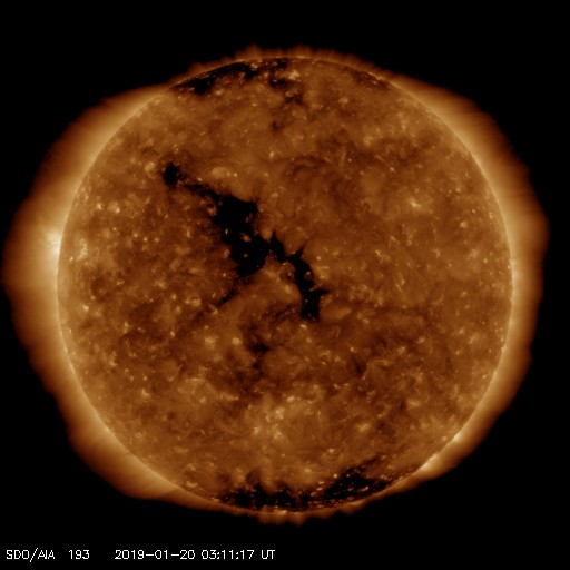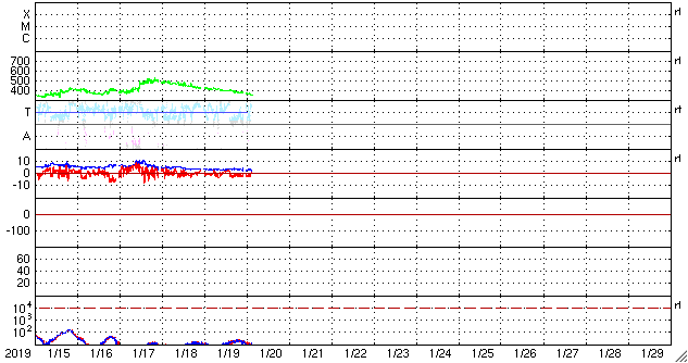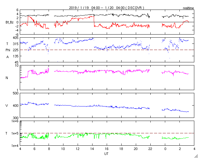 2019/ 1/20 12:29 更新 太陽風は350km/秒の低速風になっています。 担当 篠原 太陽風は、350km/秒へ速度が下がり、 低速の風になっています。 磁場強度は、3nTとやや弱い状態が続いています。 磁場の南北成分は、 グラフの後半に弱い南向きが続いています。 磁気圏では小規模の活動が 発生しているのではないかと思いますが、 AE指数はデータが途切れています。 太陽風のグラフの最後は、 北向きに変わりかけているので、 この状態であれば、この後の磁気圏は静かになりそうです。 SDO衛星AIA193では、 太陽の中央部にコロナホールが見えています。 過去2周期の広がりと比較すると、 前周期に少し小さくなった様に感じたのですが、 今回はむしろ広がりを増している様です。 27日周期の図を見ると、 前周期の高速太陽風は、12月28日に始まっています。 今回も同様のタイミングと考えると1月24日か、 あるいは、1日程度早まるかもしれません。 前周期は600km/秒に達する高速風が到来しました。 今回はどの様な変化になるでしょうか。 太陽は無黒点で、穏やかな状態が続いています。 ![]() 2周期前(54日前)、1周期前(27日前)、現在のコロナホールの様子。SDO衛星AIA193。 (c) SDO (NASA)、作図:宇宙天気ニュース ![]() SDO衛星のAIA193カメラによる太陽コロナの様子 (c) SDO (NASA) ![]() SDO衛星による太陽の可視光写真 (c) SDO (NASA) ![]() DSCOVRが観測した太陽風の磁場(1番上の枠、黒線は全体の強度、赤線は南北成分) および、太陽風の密度(3番目の紫線)、速度(4番目の青線) (c) データ:NOAA/SWPC、作図:宇宙天気ニュース ![]() AE指数(速報値) 下段のAEグラフの値が高くなると、オーロラ活動が活発化しています。 (c) 京都大学WDC ![]() ![]() 27日の太陽周期に合わせたデータプロット 太陽が同じ面を地球に向けていた27日前の変化から、今後を予想することができます。 (c) 作図:宇宙天気ニュース