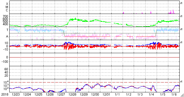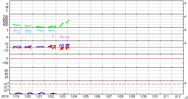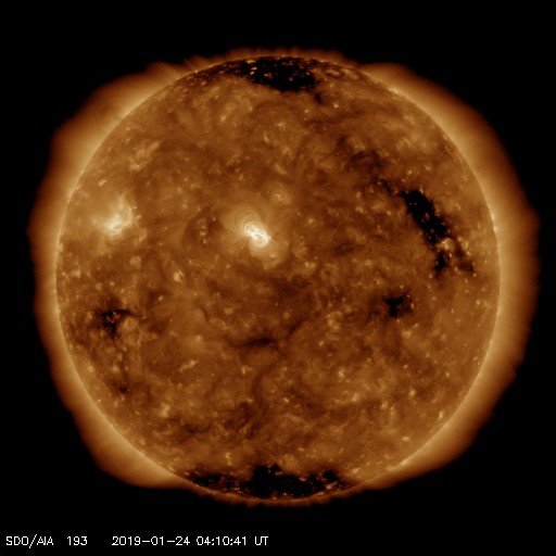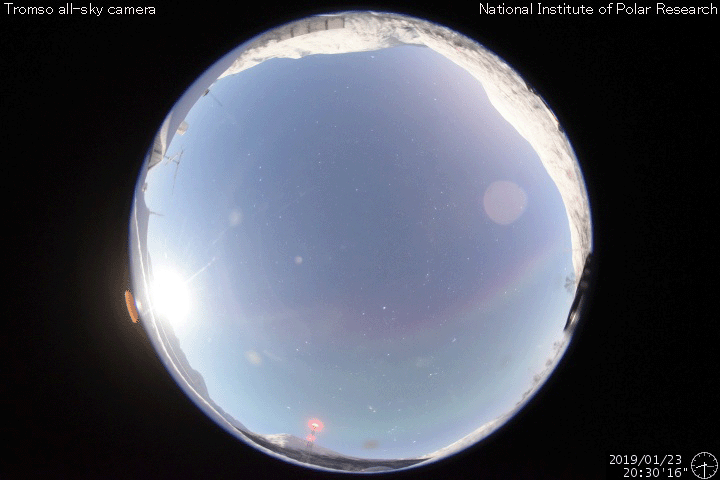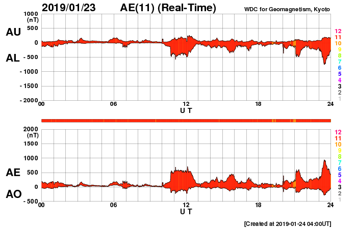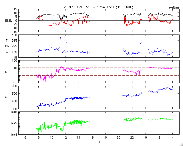 2019/ 1/24 13:19 更新 太陽風は570km/秒の高速風になり、磁気圏の活動も高まっています。 担当 篠原 太陽風の速度は、昨日のニュースの後も上昇を続け、 570km/秒の高速風に達しています。 27日周期の図を見ると、前周期より半日程早く変化が始まり、 同じくらいの速度の高まりになっています。 太陽風の磁場強度は、7nTとやや強い状態で推移しています。 南北成分は、-5nT程度の南向きの変化が頻繁に発生しています。 速度の高まりもあり、磁気圏の活動は高まって、 AE指数は、500nTや900nTに達する中規模の変化が 数回発生しています。 このうち、世界時23日21時頃のオーロラの高まりを、 ノルウェー・トロムソの全天カメラの動画で紹介します。 明るい月が空に残っているのが残念ですが、 オーロラの激しい動きを見ることができます。 前周期の高速太陽風は、4日ほど続いています。 今回はどうなるでしょうか。 太陽風磁場の南向きの変化が続くと、 オーロラも活発な状態が続きます。 引き続き注目してください。 2733黒点群は、大きさを保っています。 X線グラフでは、特に変化は見られません。 ![]() ノルウェーのトロムソで全天カメラにより撮影された、世界時23日21時頃のオーロラ。 (c) 国立極地研究所、(動画加工 : 宇宙天気ニュース) ![]() SDO衛星のAIA193カメラによる太陽コロナの様子 (c) SDO (NASA) ![]() SDO衛星による太陽の可視光写真。マウスの矢印を写真に重ねると、黒点番号付きの写真に切り替わります。 (c) SDO (NASA) ![]() DSCOVRが観測した太陽風の磁場(1番上の枠、黒線は全体の強度、赤線は南北成分) および、太陽風の密度(3番目の紫線)、速度(4番目の青線) (c) データ:NOAA/SWPC、作図:宇宙天気ニュース ![]() AE指数(速報値) 下段のAEグラフの値が高くなると、オーロラ活動が活発化しています。 (c) 京都大学WDC ![]() ![]() 27日の太陽周期に合わせたデータプロット 太陽が同じ面を地球に向けていた27日前の変化から、今後を予想することができます。 (c) 作図:宇宙天気ニュース