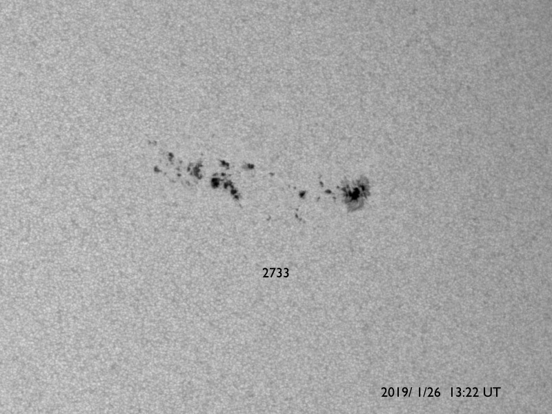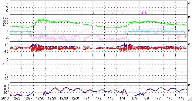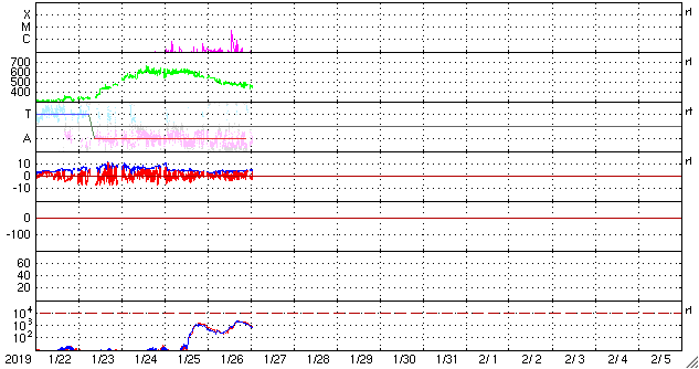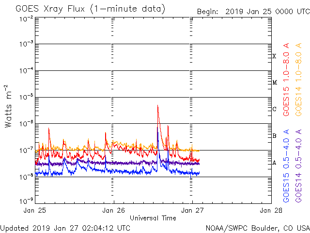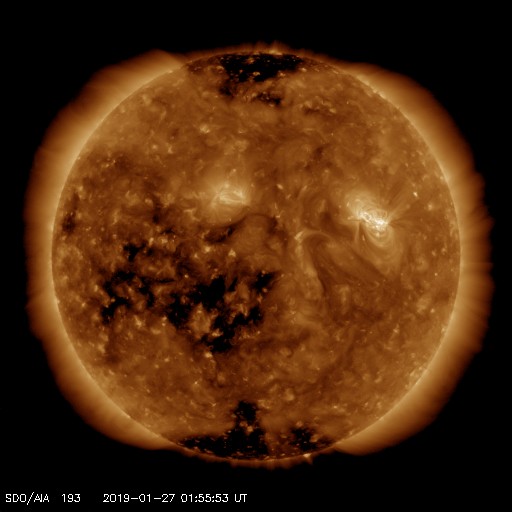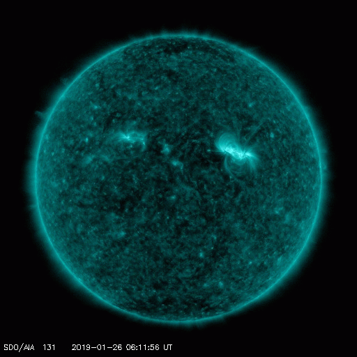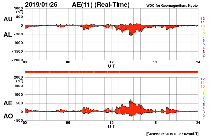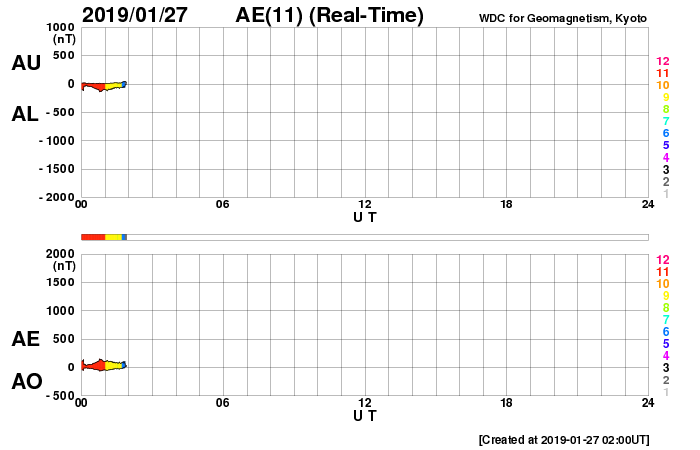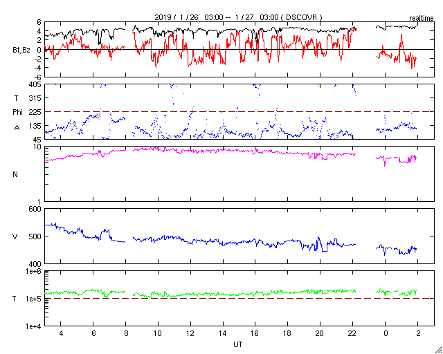 2019/ 1/27 11:09 更新 C5.0の小規模フレアが発生しました。高速太陽風は終わりに近付いています。 担当 篠原 昨夜、26日22時(世界時26日13時)に、 2733黒点群でC5.0の小規模フレアが発生しました。 SDO衛星AIA131によるフレアの動画を掲載します。 X線グラフを見ると、2733黒点群は、 昨日の朝にかけてBクラスの小さいフレアを度々起こした後、 少し間をおいて、このC5フレアを起こしています。 発生後のX線の強度は、一段下がっています。 C5に達する規模のフレアの発生は、 ほぼ1年前、2018年2月7日のC8.1以来です。 ただし、C4.6という近い規模のフレアであれば、 2018年2月10日と3月30日に発生しています。 それでも10か月ぶりです。 2733黒点群はこの後も活動を起こすでしょうか。 太陽風は450km/秒まで速度が下がり、 高速風は終わりに近付いています。 27日周期の図を見ると、 今回の高速風は3日半ほどになりそうです。 太陽風の磁場強度は、4〜5nTと平均的な状態です。 南北成分は、南北両方に変化しています。 磁気圏の活動はやや高まっていて、 AE指数は、300〜700nTの小中規模の変化が何度も発生しています。 太陽風の速度が下がってきたので、 磁気圏の変化は次第に小さくなっていくでしょう。 SDO衛星AIA193では、 次のコロナホールが太陽の中心線に達しています。 3日後くらいから次の太陽風の高まりが始まりそうです。