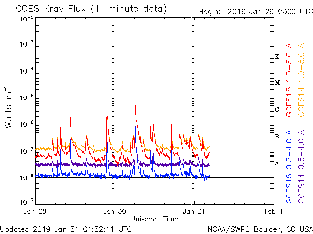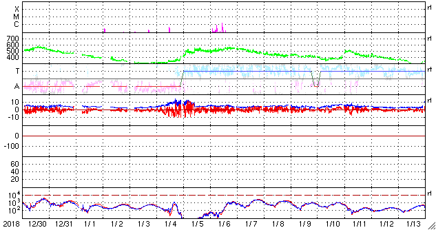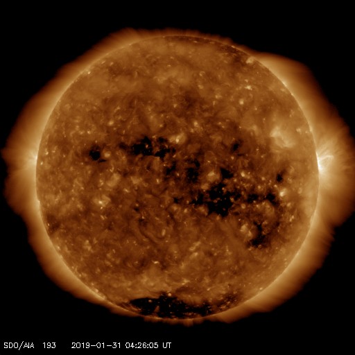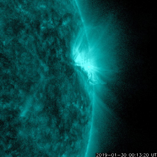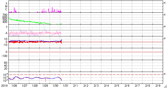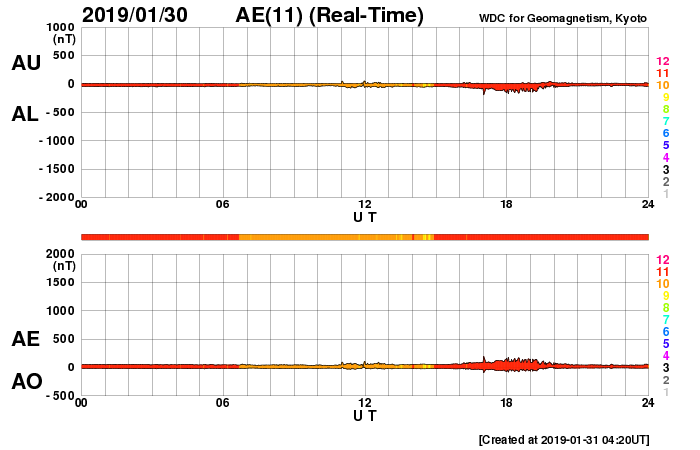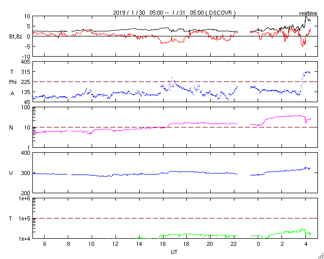 2019/ 1/31 13:36 更新 2733黒点群でC5.2の小規模フレアが発生しました。太陽風は低速です。 担当 篠原 昨日、30日15時(世界時30日6時)に、 2733黒点群でC5.2の小規模フレアが発生しました。 26日のC5.0に続く、やや大きいCクラスフレアの発生です。 SDO衛星AIA131による動画を掲載します。 2733黒点群は、この後もC1.7の小規模フレアや、 B8.5、B9.7などのBクラスの小さいフレアを 多数発生させましたが、 やがて西の端に沈んで行って、現在は見えなくなっています。 この後の活動の様子を見ることができないのは残念です。 2733群が見えなくなったため、現在の太陽は無黒点です。 太陽風は、300km/秒と低速の風が続いています。 磁場強度は、3nTとやや弱い状態が続いていましたが、 昼頃から少し強まり始め、 現在は9nTとやや高まった状態になっています。 同時に、太陽風磁場の大まかな方向の切り替わりも起きているので、 これに関連した変化かもしれません。 一方、コロナホールによる太陽風の高まりも これから始まると考えられます。 磁場の強まった状態が続けば、 やがて速度の上昇も始まるでしょう。 磁気圏は穏やかです。 AE指数は、ほとんど変化が見られない状態です。