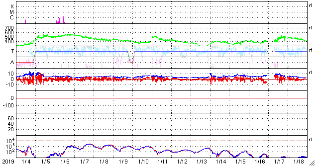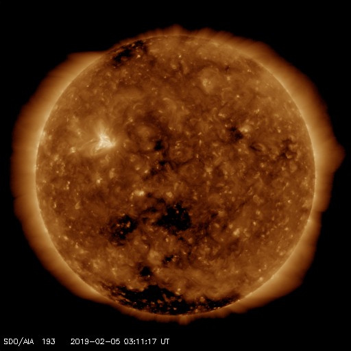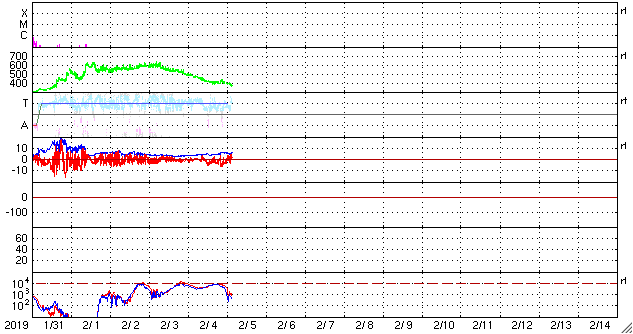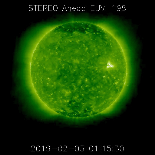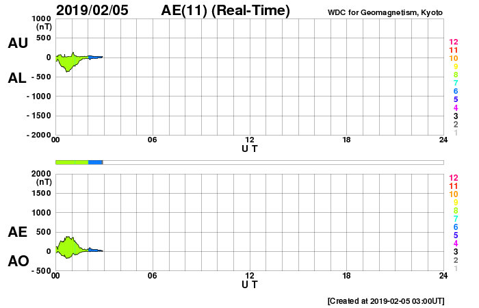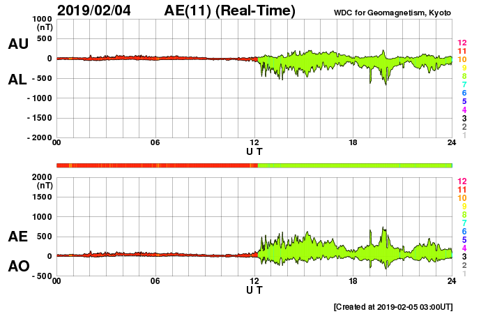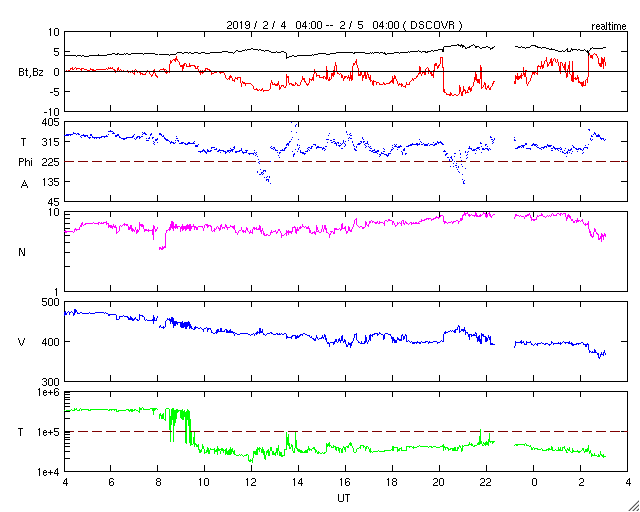 2019/ 2/ 5 12:17 更新 太陽風は平均的な状態に戻っています。 担当 篠原 太陽風の速度は、昨日のニュース以降も下がり続け、 今日に入る頃に400km/秒と平均的な速さに戻りました。 27日周期の図を見ると、今回の高速太陽風は、 前周期とだいたい同じ頃に終わりを迎えています。 太陽風の磁場強度は、4nTから5nTに少し上がり、 平均的な強さになっています。 南北成分は、グラフの中盤から 南向きに良く振れる様になっています。 このため、磁気圏の活動もやや活発になり、 AE指数では、500nT前後の小中規模の変化が グラフの途中から連続しています。 磁場の南寄りの変化は、 この後、終わってしまうかもしれません。 一方、速度はやや低速になりかけているため、 磁場の南向きの変化が続いても、 磁気圏の活動の規模は小さくなって行くでしょう。 太陽は、無黒点で穏やかです。 地球から向かって左側の太陽を観測している STEREO Ahead衛星の画像に興味深い領域が発生していると、 @halocme氏からツイートされています。 世界時2月3〜4日のSTEREO Ahead EUVI 195の動画を掲載します。 太陽の北半球の高緯度側(左上)に、 3日の途中から明るい領域が発生しています。 黒点ができているかどうかは分かりませんが、 磁場の強まりは出現していると考えられます。 発生した緯度から考えると、 新しい第25活動周期の特徴(磁場の並び)を持っている可能性があります。 この位置は、地球からは太陽の裏側になるため、 まだこちらから見ることはできません。 この動画の太陽の中央線を越えるくらいまで進むと、 SDO衛星などで観測できる様になります。 3〜4日くらい後になりそうですが、それまで残っているでしょうか。 出現が楽しみな領域です。