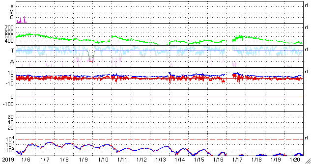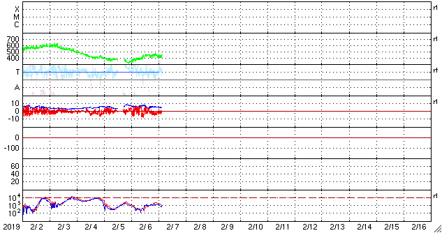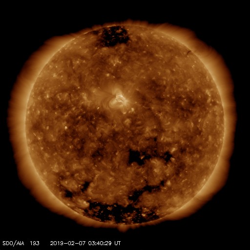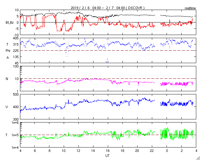 2019/ 2/ 7 12:47 更新 太陽風の速度が少し高まっています。太陽は無黒点です。 担当 篠原 太陽風は、昨夜から速度が上昇を始めて、 今日に入る頃、450km/秒とやや高速の状態になりました。 4日のニュースで、 太陽の南側の淡いコロナホールについて紹介しましたが、 その影響が来たのかもしれません。 27日周期の図を見ると、 前周期の1月11日にも小さい速度の高まりが到来しています。 その後、速度は400〜450km/秒の間で推移しています。 磁場強度は、速度が上がり始める頃に8nTに少し高まりましたが、 現在は5nTに戻っています。 磁場の南北成分は、南寄りの変化が続いて、 AE指数は500〜800nTの変化が数回発生しています。 太陽風のグラフの最後では、 南北成分は0nTに近くなっています。 それに合わせて、AE指数の変化も現在は小さくなっています。 SDO衛星AIA193の太陽写真では、 南半球のコロナホールは、 左端が太陽の中心線に残るくらいに広がっています。 太陽風の高まりはどのくらい続くでしょうか。 太陽は、昨日の小さい磁場の強まりは、 その後小さくなって、現在は見えなくなっています。 太陽の向こう側の領域もありましたが、 第25期の太陽が少しずつ姿を見せ始めているのかもしれません。 現在の太陽は、無黒点で穏やかです。