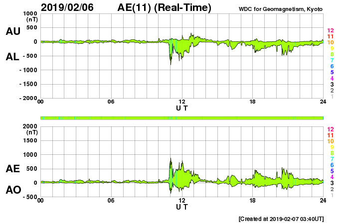 (c) SDO (NASA) ![]() SDO衛星による太陽の可視光写真 (c) SDO (NASA) ![]() DSCOVRが観測した太陽風の磁場(1番上の枠、黒線は全体の強度、赤線は南北成分) および、太陽風の密度(3番目の紫線)、速度(4番目の青線) (c) データ:NOAA/SWPC、作図:宇宙天気ニュース ![]() AE指数(速報値) 下段のAEグラフの値が高くなると、オーロラ活動が活発化しています。 (c) 京都大学WDC ![]() ![]() 27日の太陽周期に合わせたデータプロット 太陽が同じ面を地球に向けていた27日前の変化から、今後を予想することができます。 (c) 作図:宇宙天気ニュース