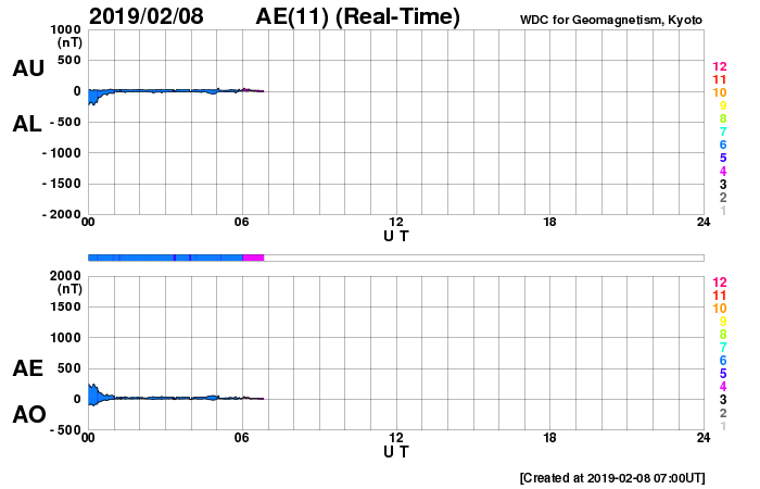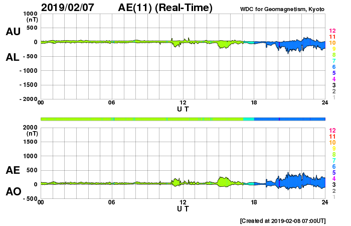 下段のAEグラフの値が高くなると、オーロラ活動が活発化しています。