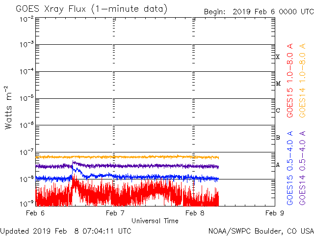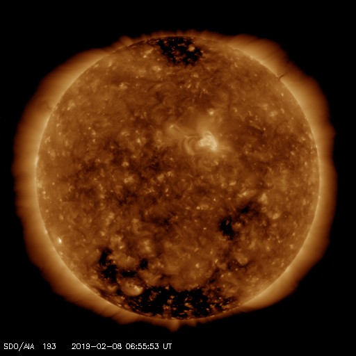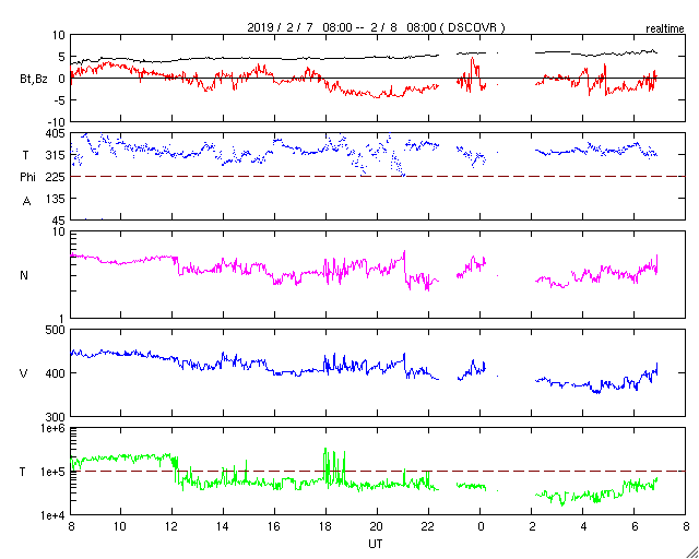 - 2019/ 2/ 7 12:47 太陽風の速度が少し高まっています。太陽は無黒点です。
