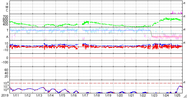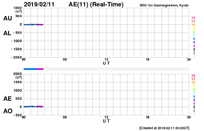 (c) SDO (NASA)、作図:宇宙天気ニュース ![]() SDO衛星のAIA193カメラによる太陽コロナの様子 (c) SDO (NASA) ![]() SDO衛星による太陽の可視光写真 (c) SDO (NASA) ![]() GOES衛星の太陽X線データ (c) NOAA/SWPC ![]() DSCOVRが観測した太陽風の磁場(1番上の枠、黒線は全体の強度、赤線は南北成分) および、太陽風の密度(3番目の紫線)、速度(4番目の青線) (c) データ:NOAA/SWPC、作図:宇宙天気ニュース ![]() AE指数(速報値) 下段のAEグラフの値が高くなると、オーロラ活動が活発化しています。 (c) 京都大学WDC ![]() ![]() 27日の太陽周期に合わせたデータプロット 太陽が同じ面を地球に向けていた27日前の変化から、今後を予想することができます。 (c) 作図:宇宙天気ニュース