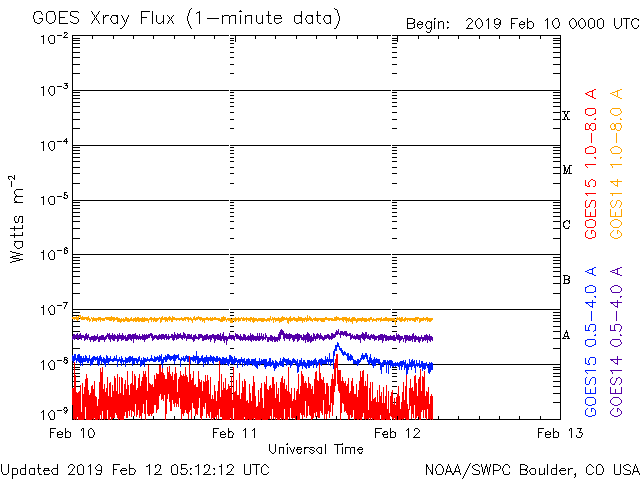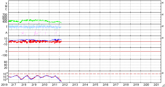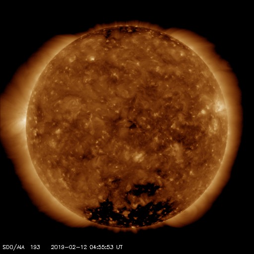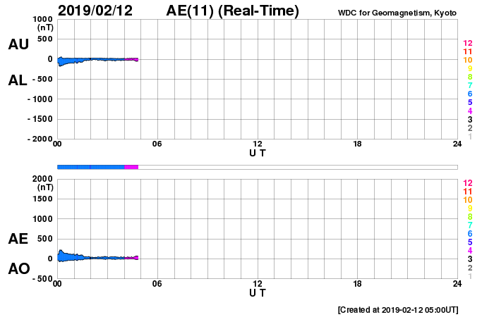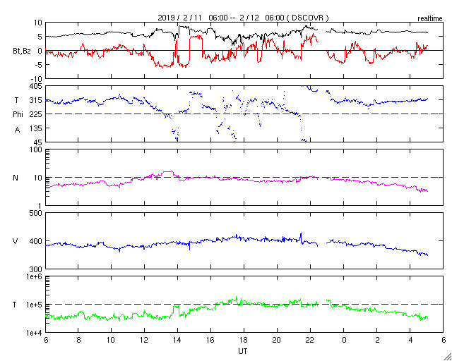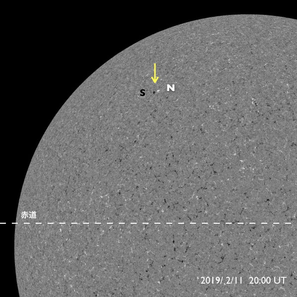 2019/ 2/12 14:14 更新 太陽に第25期の磁場の並びが現れています。太陽風は穏やかです。 担当 篠原 2月6日のニュースで、 太陽の新しい活動周期の特徴を持った 磁場の強まりについて紹介しましたが、 今日も同じ北半球側に新しい周期の磁場の並びが出現しています。 1枚目にSDO衛星による磁場の写真を掲載します。 黄色の矢印の先の小さい領域ですが、 右にN極(白)、左にS極(黒)の並びができています。 現れた緯度は37度くらいで、 高めの緯度に発生するのも新しい活動周期の始まりの頃の特徴です。 SDO衛星AIA193のコロナ写真では、 明るい光の点として見えています。 一方、可視光写真には、黒点は現れていない様です。 少しずつ、新しい第25期の姿が見え始めています。 太陽は無黒点が続いています。 X線グラフも特に変化はありません。 太陽風は、380km/秒から一旦400km/秒に上がり、 再び360km/秒へ下がる小幅の変化をしています。 磁場強度は、上下の変化はありますが、 6nT前後で推移しています。 磁場の南北成分は、南向きにやや強まる変化をしています。 AE指数は、データが途切れていますが、 磁気圏の活動は少し高まっていた様です。 SDO衛視AIA193では、 太陽の南半球の高緯度域にコロナホールが広がっています。 緯度は高いですが、影響はやって来るでしょうか。 低緯度域にコロナホールはなく、 基本的には太陽風は穏やかに推移しそうです。