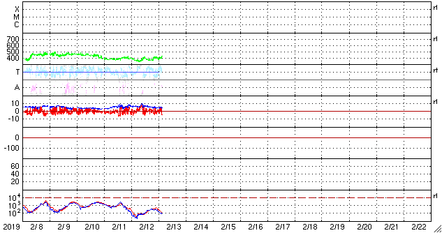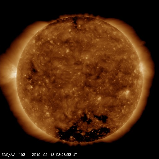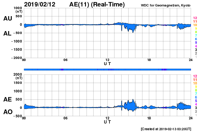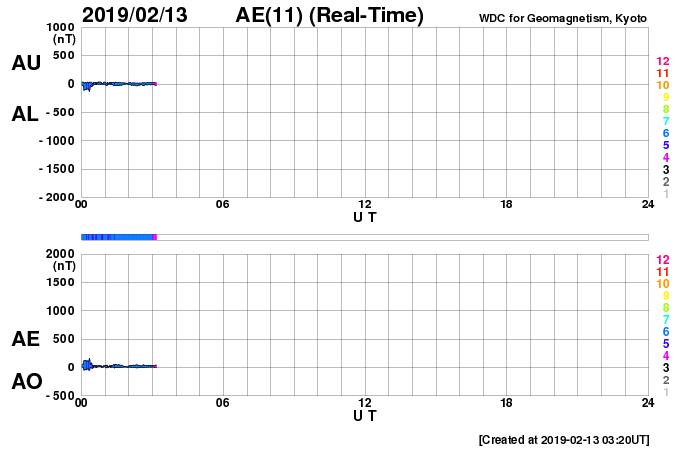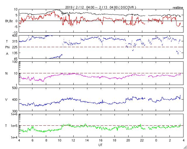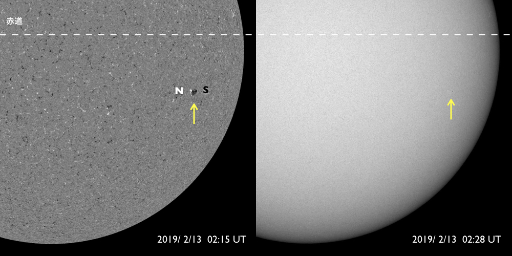 2019/ 2/13 12:42 更新 太陽の南半球に第25期の磁場の並びを持つ黒点が現れています。 担当 篠原 昨日に続いて、今度は太陽の南半球に、 新しい活動周期の磁場の並びを持った領域が現れています。 昨日の磁場の強まりは、その後弱くなって見えなくなりました。 それに続くように、太陽の南西側(右下側)に磁場の強まりが現れ、 可視光写真を拡大すると、小さい黒点も見えています。 出現緯度は、南緯17度くらいです。 昨日の領域よりも低緯度ですが、 赤道からはある程度離れているので、 新しい活動周期の領域と考えて良いのではないかと思います。 磁場の並びは、右にS極(黒)、左にN極(白)です。 これは、昨日の北半球の領域と反対になっています。 北半球と南半球の黒点の磁場の並びは反対になるので、 今回の黒点の磁場は、 新しい第25活動周期の南半球の特徴を持っていると言えます。 新しい領域の現れる頻度が上がってきたのでしょうか。 今後の推移に注目して下さい。 太陽風は、400km/秒と平均的な速度に戻っています。 磁場強度は、5nTと平均的な状態です。 磁気圏は全体としては穏やかですが、 AE指数には小規模の変化も発生しています。 27日周期の図を見ると、 前周期はこの後に速度の高まりが来ています。 今回はどうなるでしょうか。 ![]() 太陽の南半球に現れた、新しい第25活動周期の磁場の並び。SDO衛星。 (c) SDO (NASA)、作図:宇宙天気ニュース ![]() SDO衛星のAIA193カメラによる太陽コロナの様子 (c) SDO (NASA) ![]() SDO衛星による太陽の可視光写真。マウスの矢印を写真に重ねると、黒点番号付きの写真に切り替わります。 (c) SDO (NASA) ![]() GOES衛星の太陽X線データ (c) NOAA/SWPC ![]() DSCOVRが観測した太陽風の磁場(1番上の枠、黒線は全体の強度、赤線は南北成分) および、太陽風の密度(3番目の紫線)、速度(4番目の青線) (c) データ:NOAA/SWPC、作図:宇宙天気ニュース ![]() AE指数(速報値) 下段のAEグラフの値が高くなると、オーロラ活動が活発化しています。 (c) 京都大学WDC ![]() ![]() 27日の太陽周期に合わせたデータプロット 太陽が同じ面を地球に向けていた27日前の変化から、今後を予想することができます。 (c) 作図:宇宙天気ニュース