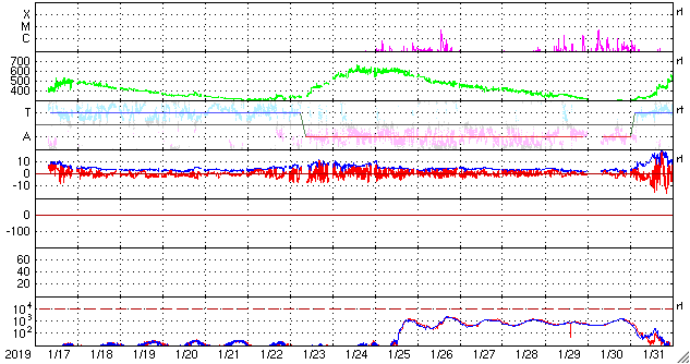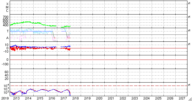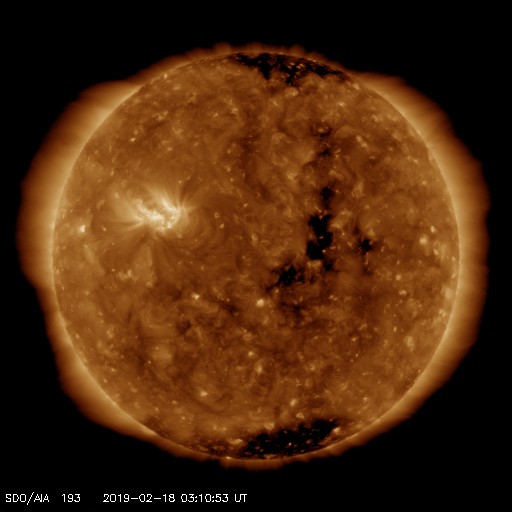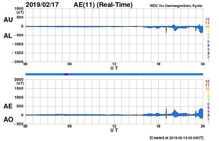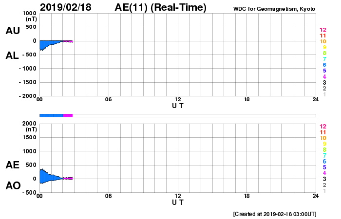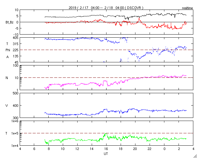 2019/ 2/18 12:17 更新 太陽風は350km/秒の低速風です。 担当 篠原 太陽風は低速の状態が続いています。 昨日のニュースの時点で、 太陽風の最新データは欠測になっていましたが、 回復した夕方には320km/秒と速度は更に下がっていました。 今日に入った頃に350km/秒へ少し上がり、 現在までこの速さが続いています。 一方、太陽風の磁場強度は、 今朝までは4〜5nTで推移していましたが、 その後、7nTに少し高まる変化が到来しています。 強度の変化としては小さいものですが、 南北成分が南向きに偏って振れる様になり、 -3〜 -5nTの状態が5時間ほど続いています。 グラフの最後に、0nTに戻る変化が見えています。 この後は南北どちらに振れるでしょうか。 磁気圏では、磁場の南向きが続いていた頃に、 AE指数で200〜300nTの小規模の変化が起きています。 速度が下がっていることもあり、 目立つ程の変化にはなっていません。 SDO衛星AIA193では、 太陽の中央部のコロナホールが西に進み、 地球へ影響が及び始める目安の位置に近付いています。 明日以降の太陽風の変化に注目してください。 太陽は無黒点で、穏やかな状態が続いています。 ![]() SDO衛星のAIA193カメラによる太陽コロナの様子 (c) SDO (NASA) ![]() SDO衛星による太陽の可視光写真 (c) SDO (NASA) ![]() DSCOVRが観測した太陽風の磁場(1番上の枠、黒線は全体の強度、赤線は南北成分) および、太陽風の密度(3番目の紫線)、速度(4番目の青線) (c) データ:NOAA/SWPC、作図:宇宙天気ニュース ![]() AE指数(速報値) 下段のAEグラフの値が高くなると、オーロラ活動が活発化しています。 (c) 京都大学WDC ![]() ![]() 27日の太陽周期に合わせたデータプロット 太陽が同じ面を地球に向けていた27日前の変化から、今後を予想することができます。 (c) 作図:宇宙天気ニュース