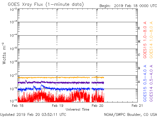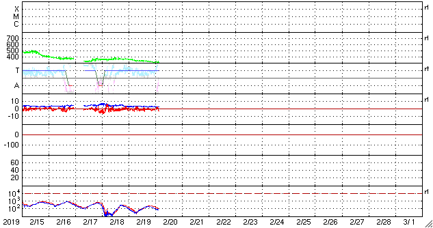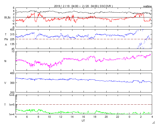 - 2019/ 2/16 13:04 太陽風は平均的な速度に戻りました。磁気圏も静穏です。