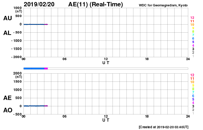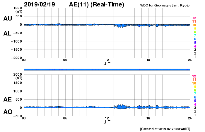 下段のAEグラフの値が高くなると、オーロラ活動が活発化しています。