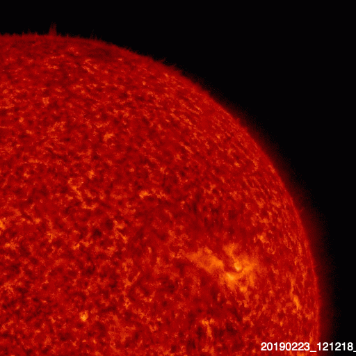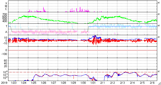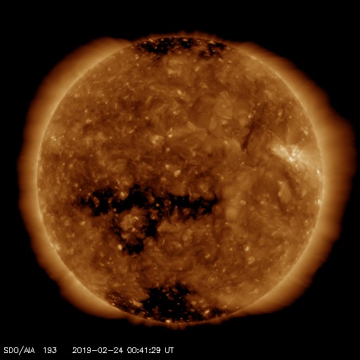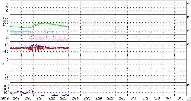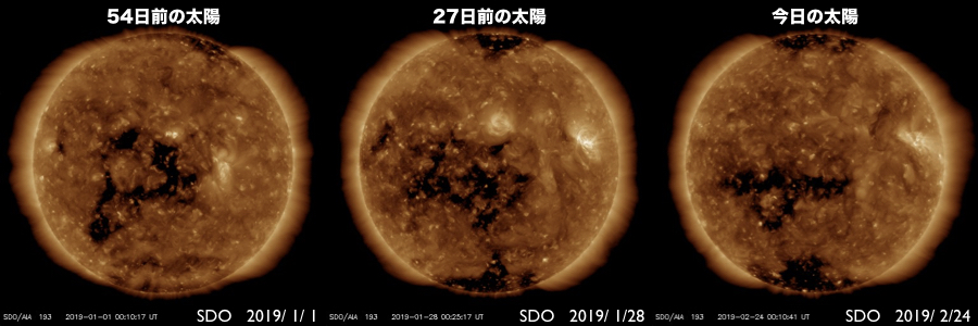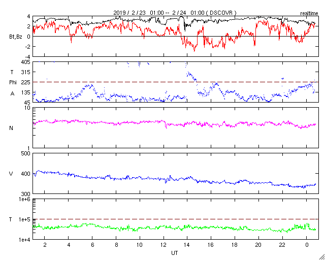 2019/ 2/24 09:55 更新 太陽風は低速になっています。磁気圏も穏やかです。 担当 篠原 太陽風の速度は、330km/秒まで下がって、 低速の風になっています。 磁場強度は、3〜4nTとやや弱い状態が続いています。 磁場の南北成分は北寄りに推移していて、 磁気圏も穏やかです。 AE指数は、太陽風磁場が弱い南向きになった頃に、 200nTの小さい変化を起こした程度です。 SDO衛星AIA193の太陽写真では、 太陽の中央部の南寄りに、 コロナホールが東西方向に広がっています。 このコロナホールは形を変えながら、 ずっとこの辺りに広がっていて、 高速の太陽風を繰り返し地球にもたらしています。 2周期前からの広がりの変化を1枚目の図で紹介します。 27日周期の図を見ると、前周期の太陽風は、 1月31日に速度の上昇が始まっています。 今回も、26〜27日あたりから太陽風の変化が始まりそうです。 前回は、600km/秒まで太陽風の速度は高まりました。 コロナホールの広がりの様子から、 今回も同じくらいの変化が見られるのではないでしょうか。 オーロラの活動にも注目して下さい。 太陽は無黒点です。 太陽の西側で、今朝くらいからフィラメント噴出が始まっています。 ちょうど噴き上がるところまでSDO衛星で撮影されています。 AIA304による動画を掲載します。 CME(太陽ガスの放出現象)として飛び出しそうですが、 西側に寄っているので、地球への影響は小さいでしょう。 ![]() 2周期前(54日前)、1周期前(27日前)、現在のコロナホールの様子。SDO衛星AIA193。 (c) SDO (NASA)、作図:宇宙天気ニュース ![]() 太陽の西側でフィラメント噴出が発生しています。SDO衛星AIA304。 (c) SDO (NASA)、(動画加工 : 宇宙天気ニュース) ![]() SDO衛星のAIA193カメラによる太陽コロナの様子 (c) SDO (NASA) ![]() SDO衛星による太陽の可視光写真 (c) SDO (NASA) ![]() DSCOVRが観測した太陽風の磁場(1番上の枠、黒線は全体の強度、赤線は南北成分) および、太陽風の密度(3番目の紫線)、速度(4番目の青線) (c) データ:NOAA/SWPC、作図:宇宙天気ニュース ![]() AE指数(速報値) 下段のAEグラフの値が高くなると、オーロラ活動が活発化しています。 (c) 京都大学WDC ![]() ![]() 27日の太陽周期に合わせたデータプロット 太陽が同じ面を地球に向けていた27日前の変化から、今後を予想することができます。 (c) 作図:宇宙天気ニュース