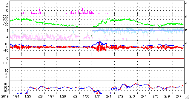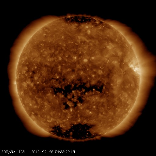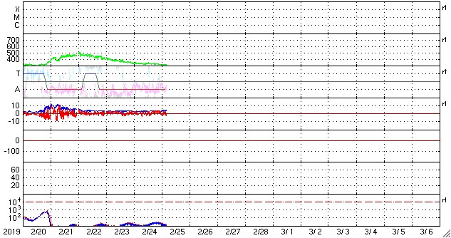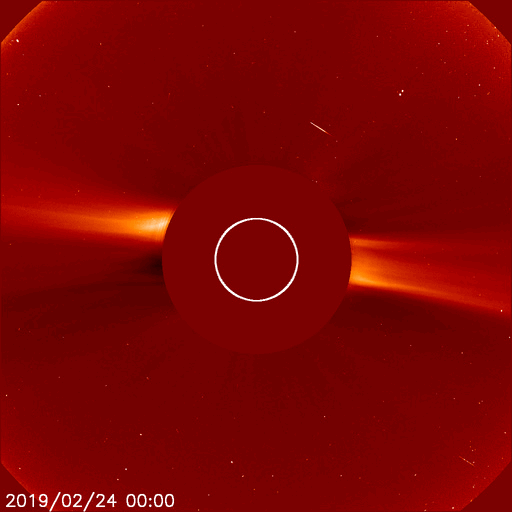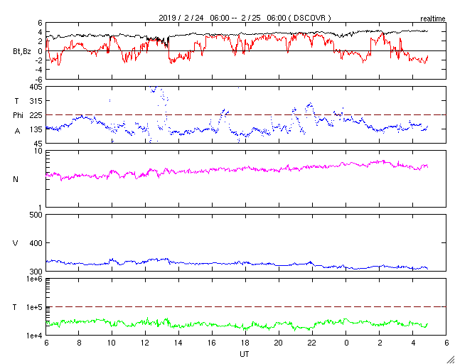2019/ 2/25 14:09 更新 太陽風は更に低速になっています。磁気圏は穏やかです。 担当 篠原 昨日のフィラメント噴出によるCME(太陽ガスの放出現象)が、 SOHO衛星LASCO C2、C3のカメラで撮影されました。 動画を掲載します。 太陽の右に向かってガスが淡く広がっています。 地球への影響はないでしょう。 その後、太陽は穏やかに推移しています。 太陽風は、330km/秒から310km/秒へ、 更に速度が下がっています。 磁場強度は、3nTから4nTに少し上がっています。 磁気圏は穏やかで、 AE指数はほとんど変化のない状態です。 SDO衛星AIA193の太陽写真では、 コロナホールが太陽の中央部に広がっていて、 地球の方向へ速度の高い太陽風を噴き出しているところです。 3日後には、高速太陽風が強まっているでしょう。