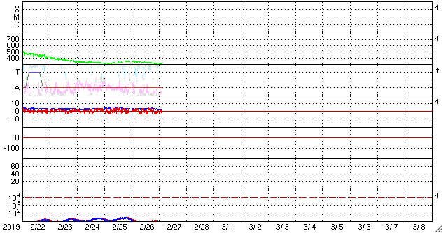 - 2019/ 2/23 08:50 太陽風の速度は平均的な速さに戻っています。磁気圏も穏やかです。