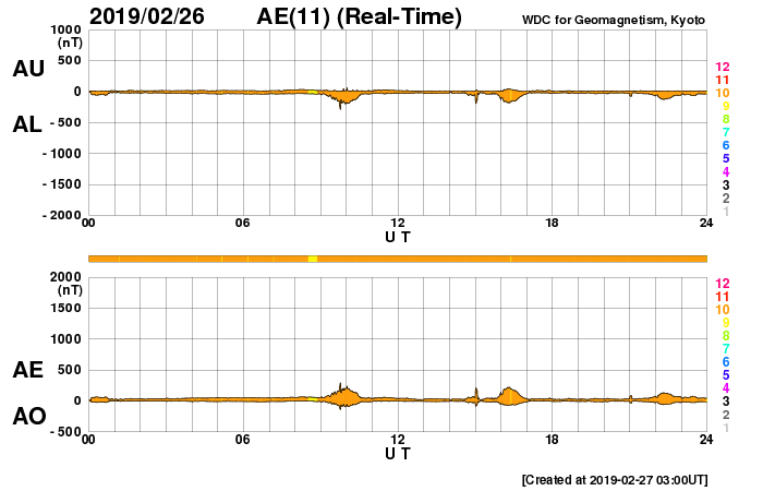 下段のAEグラフの値が高くなると、オーロラ活動が活発化しています。