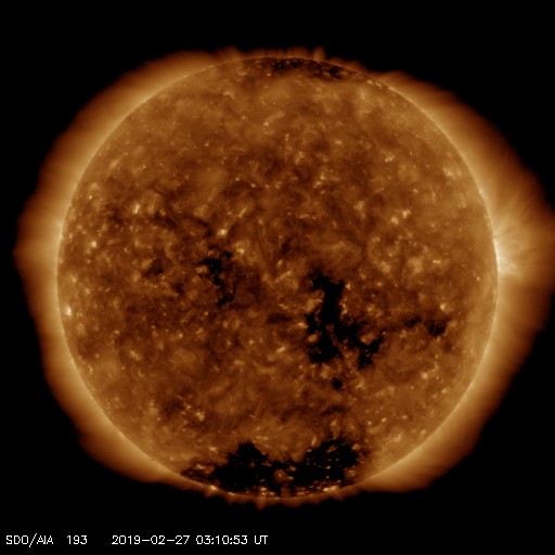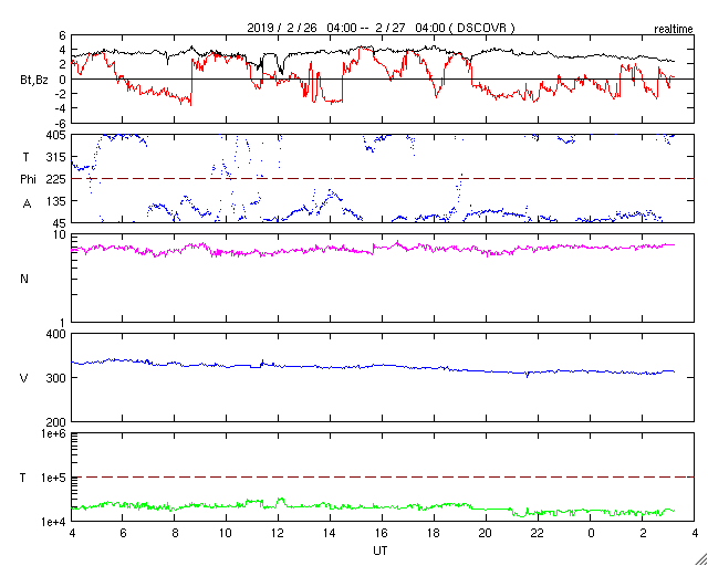 - 2019/ 2/26 13:18 太陽風は低速風が続いています。コロナホールの影響が近付いています。