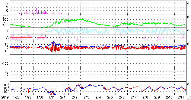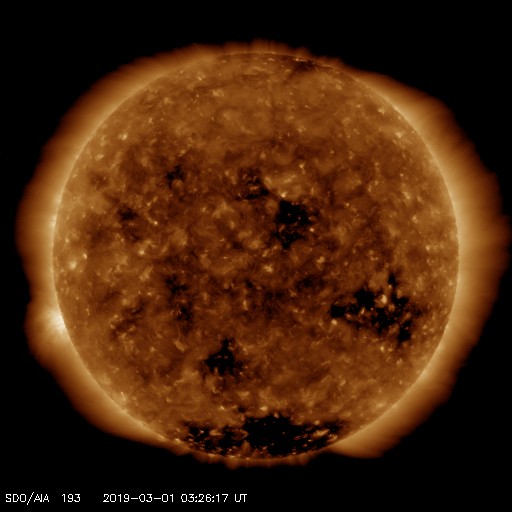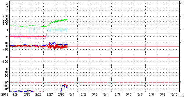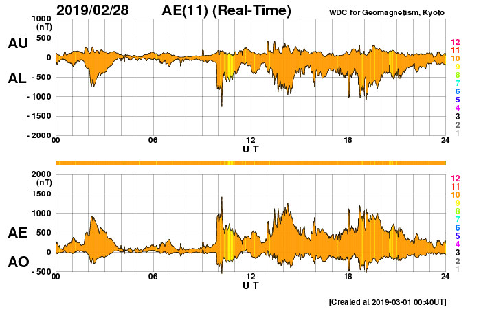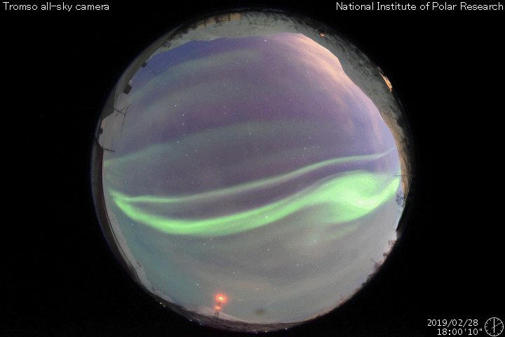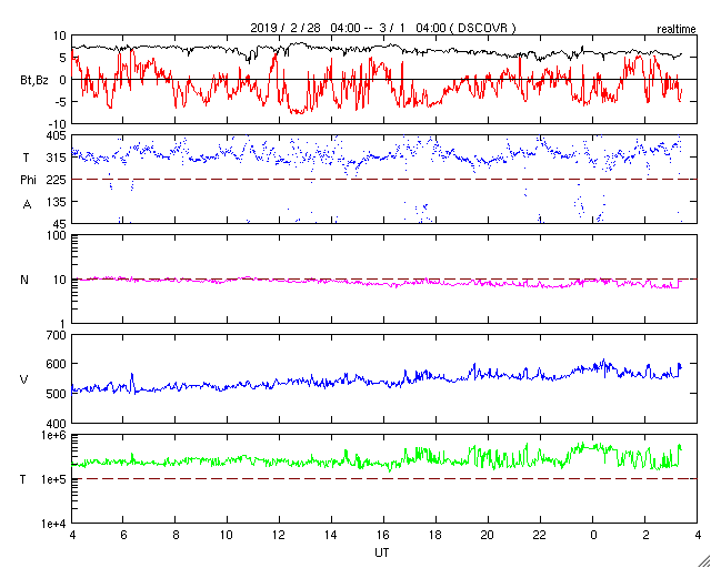 2019/ 3/ 1 12:31 更新 太陽風の速度は更に上がり、磁気圏の活動も活発です。 担当 篠原 太陽風の速度は、500km/秒から570km/秒へ高まっています。 27日周期の図の前周期の高まりに近い速さに達しています。 反対に、磁場強度は7nTから5nTへ少し下がり、 平均的な状態に戻っています。 太陽風磁場の南北成分は、 全体として南寄りの傾向になっています。 -5nT程度の南向きの変化が頻繁に発生して、 速度の高まりと重なり、磁気圏の活動を高めています。 AE指数のグラフは、 1000nTを少し超えるくらいの大きな変化が 繰り返し発生しています。 昨日に続き、 ノルウェー・トロムソの全天カメラの動画を掲載します。 世界時28日18〜19時頃のオーロラで、 AE指数の変化は1200nTに達しています。 太陽風の磁場強度が下がり始めて、 今後は南向きの変化も少しずつ小さくなりそうです。 その場合、磁気圏の活動も次第に小さくなっていくでしょう。 前周期の高速太陽風は、この後2日半ほど続いています。 今回はどうなるでしょうか。 太陽は無黒点です。 東端の南半球の向こう側から、 活動的な領域が近づいています。 どの様な領域が現れるでしょうか。 ![]() ノルウェーのトロムソで全天カメラにより撮影された、世界時28日18〜19時頃のオーロラ。 (c) 国立極地研究所、(動画加工 : 宇宙天気ニュース) ![]() SDO衛星のAIA193カメラによる太陽コロナの様子 (c) SDO (NASA) ![]() SDO衛星による太陽の可視光写真 (c) SDO (NASA) ![]() DSCOVRが観測した太陽風の磁場(1番上の枠、黒線は全体の強度、赤線は南北成分) および、太陽風の密度(3番目の紫線)、速度(4番目の青線) (c) データ:NOAA/SWPC、作図:宇宙天気ニュース ![]() AE指数(速報値) 下段のAEグラフの値が高くなると、オーロラ活動が活発化しています。 (c) 京都大学WDC ![]() ![]() 27日の太陽周期に合わせたデータプロット 太陽が同じ面を地球に向けていた27日前の変化から、今後を予想することができます。 (c) 作図:宇宙天気ニュース