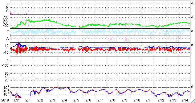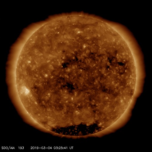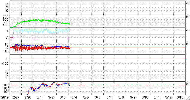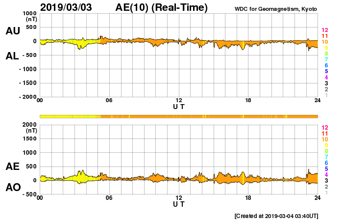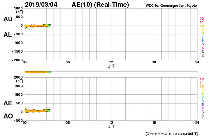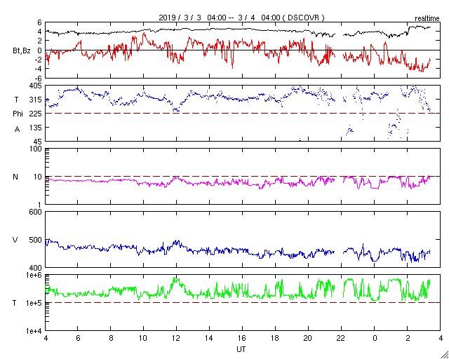 2019/ 3/ 4 12:31 更新 高速太陽風は終わりを迎えています。2月の黒点数は 0.8 でした。 担当 篠原 WDC-SILSOより、 2月の黒点相対数の月平均値は、 0.8 と発表されました。 この数字が1を割るのは、 前の極小期の2009年8月以来で、10年ぶりです。 ちなみに、この2009年8月は1か月間完全に無黒点で、 3枚目の図の黒点相対数0の日のグラフでは、 唯一30日を超える場所に点が打たれています。 前の極小期では、月平均値が1を下回ったのは、 2008年7月、8月、2009年3月、8月の4回ありました。 今回はどのくらい発生するでしょうか。 また、黒点が見えなかった黒点相対数0の日は26日でした。 28日しかない2月なので、 黒点が見えたのは13日と21日の2日だけです。 黒点が少なくなる一方で、 昨日も紹介した様に、 新しい活動周期の特徴を持った領域が現れる様になっています。 第25活動周期への切り替わりは進んでいる様です。 今日の太陽は、南東(左下)に昨日紹介した磁場の強まりがありますが、 黒点はなく、可視光写真に白斑が見えているだけです。 X線グラフも変化はなく、穏やかです。 太陽風は、450km/秒まで速度が下がっています。 磁場強度は、4nT前後で推移しています。 27日周期の図の前周期と同じくらいに 高速太陽風は終わりを迎えています。 この後、前周期の太陽風は400km/秒台で推移していました。 今回も同じ様な変化になるかもしれません。 磁気圏の活動は更に弱くなり、 AE指数は小規模の変化が見られる程度になっています。 この後も、基本的には穏やかな状態が続きそうです。 放射線帯の高エネルギー電子は、 1万を超えた状態が続いています。 太陽風が落ち着いてきたので、今後は次第に減少していくでしょう。