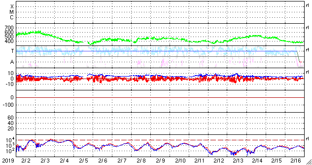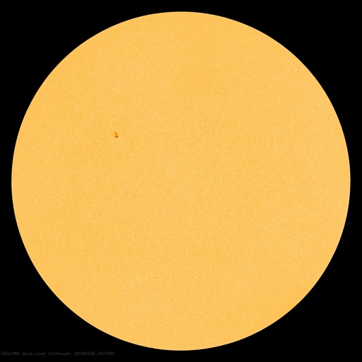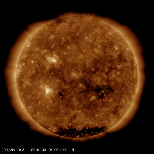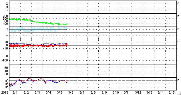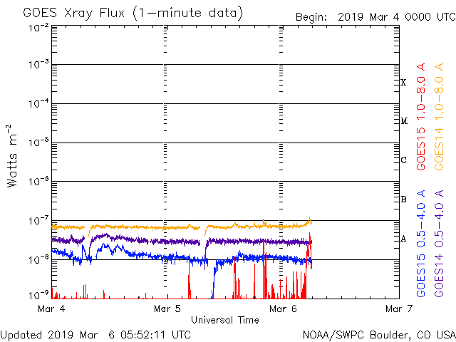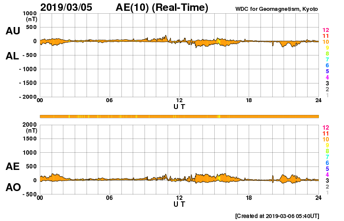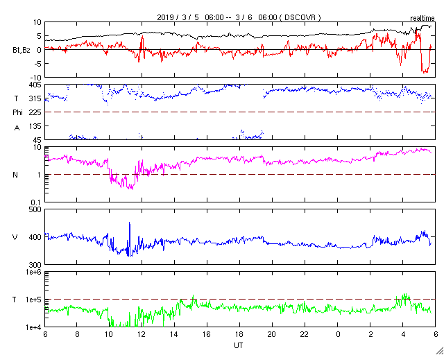 2019/ 3/ 6 14:51 更新 太陽に2734黒点群が見えています。太陽風は平均的な速さです。 担当 篠原 昨日、太陽の北半球の東側に見えていた小さい黒点が大きくなり、 2734黒点群と番号が付けられています。 NOAAの群番号が付けられた黒点は、 1月下旬にC5のフレアなどを起こした2733黒点群以来です。 今のところ、X線グラフは目立った変化はありませんが、 2734群の今後の変化に注目してください。 太陽風は、380〜400km/秒と平均的な速度が続いています。 磁場の南北成分は、0nT付近で小さく変化していて、 磁気圏は穏やかです。 AE指数は、小規模の変化が時々起きている程度です。 ただし、太陽風のグラフの最後で、 磁場が -7nTと大きく南を向く変化が発生しています。 この変化が今後も続くと、 磁気圏の活動を高めることになるでしょう。 今日から、種子島ロケットコンテストに参加するため 種子島に来ています。 初日は発表会ですが、昼頃は激しい雨になりました。 明日は天気が回復しそうですが、風が心配です。 来週は研究会も重なり、 1週間後の13日まで更新時刻が不定期になります。 ご了解下さい。 ![]() SDO衛星のAIA193カメラによる太陽コロナの様子 (c) SDO (NASA) ![]() SDO衛星による太陽の可視光写真。マウスの矢印を写真に重ねると、黒点番号付きの写真に切り替わります。 (c) SDO (NASA) ![]() GOES衛星の太陽X線データ (c) NOAA/SWPC ![]() DSCOVRが観測した太陽風の磁場(1番上の枠、黒線は全体の強度、赤線は南北成分) および、太陽風の密度(3番目の紫線)、速度(4番目の青線) (c) データ:NOAA/SWPC、作図:宇宙天気ニュース ![]() AE指数(速報値) 下段のAEグラフの値が高くなると、オーロラ活動が活発化しています。 (c) 京都大学WDC ![]() ![]() 27日の太陽周期に合わせたデータプロット 太陽が同じ面を地球に向けていた27日前の変化から、今後を予想することができます。 (c) 作図:宇宙天気ニュース
