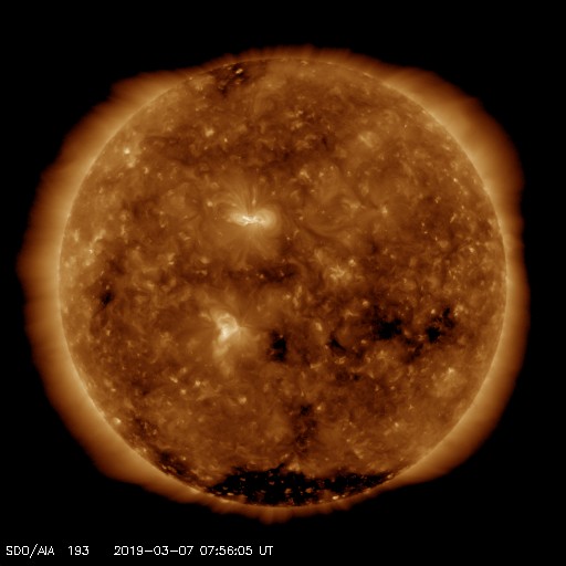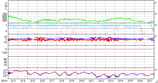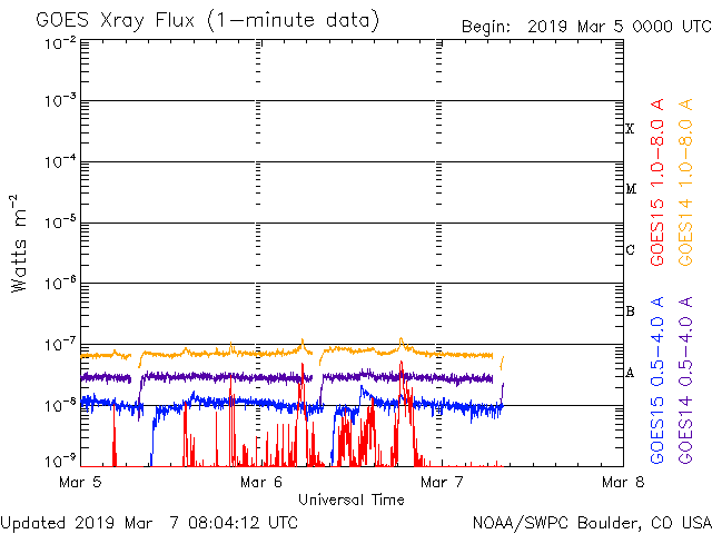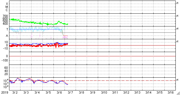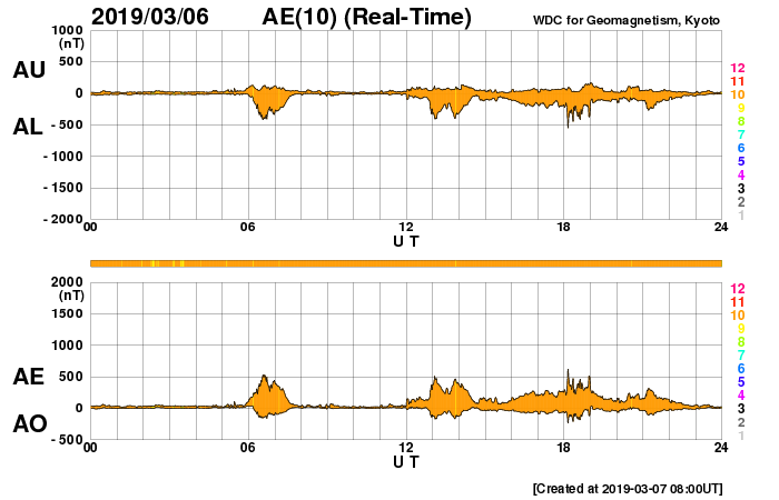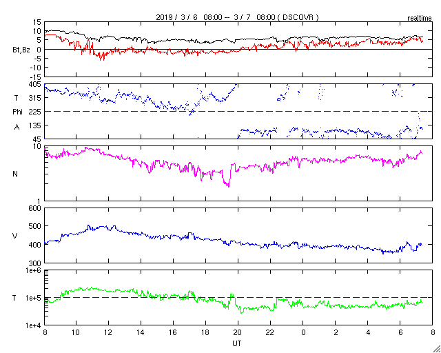 2019/ 3/ 7 17:12 更新 太陽風は平均的な状態が続いています。 担当 篠原 太陽風の速度は、 一時的に500km/秒に上がる変化が起きていますが、 全体としては400km/秒と平均的な状態が続いています。 磁場強度も、5nTと平均的な状態です。 磁場の南北成分は、 グラフの前半は南寄り、後半は北寄りに変化しています。 磁気圏では、AE指数500nT程度の中規模の変化がしばらく続き、 その後は穏やかになっています。 27日周期の図の前周期の太陽風は、 400km/秒前後の状態が続いています。 今後も同様の変化になるかもしれません。 太陽は、2734黒点群が見えています。 SDO衛星のAIAカメラでは、 2734黒点群は小さい活動を起こしていますが、 X線グラフでは目立つほどの変化になっていません。 今日は更新が遅くなり申し訳ありません。 種子島ロケットコンテストの競技1日目でした。 風が強くて大変でしたが、楽しい大会になりました。 明日は競技の2日目です。