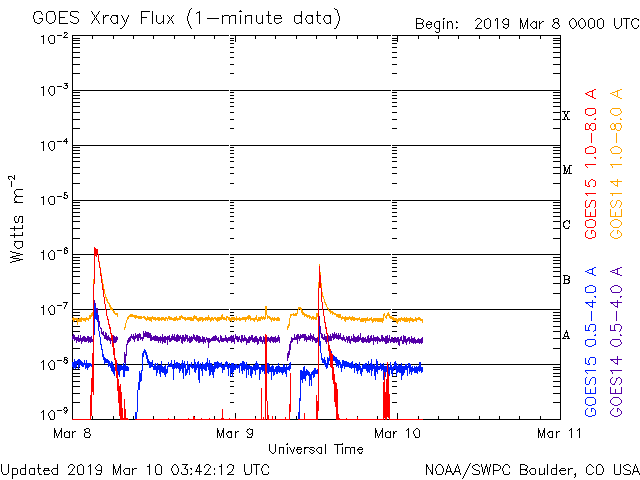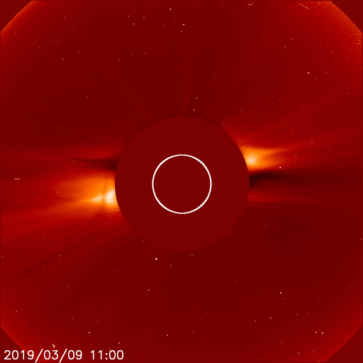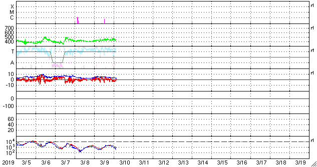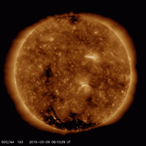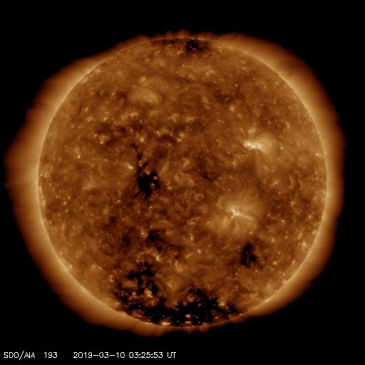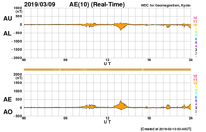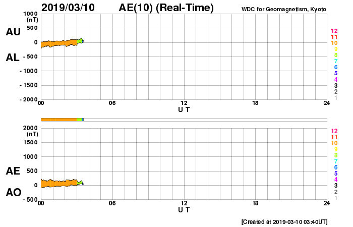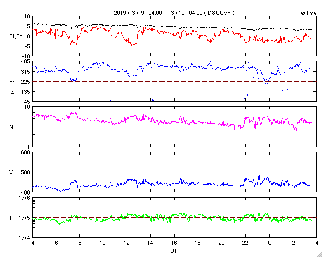 2019/ 3/10 12:44 更新 B6の小さいフレアが発生しています。太陽風は400km/秒台前半の速度が続いています。 担当 篠原 2734黒点群で、昨夜、9日21時半(世界時9日12時半)に、 B6.1の小さいフレアが発生しました。 SDO衛星AIA193による動画を掲載します。 フレアとしては小さい規模ですが、 動画では、爆発の衝撃が大きく広がっている様子が見えています。 SOHO衛星LASCO C2では、かなり淡いですが、 CME(太陽ガスの放出現象)も飛び出している様です。 こちらも4日後くらいと考えると、 13日頃に地球に影響がやって来るかもしれません。 2734黒点群は少し小さくなっている印象です。 その他に黒点はありません。 太陽風は、420〜440km/秒の速度で推移しています。 昨日より、少しだけ高まっています。 磁場強度は、5nTから3nTに下がっていて、 少し弱まった状態です。 磁気圏は概ね静穏で、 AE指数は小規模の変化が時々起きている程度です。 SDO衛星AIA193の太陽写真では、 南極から赤道へかけて、縦に淡いコロナホールが伸びています。 明日くらいに太陽の中心線に達しそうです。 4〜5日後くらいにこの領域の影響が見られるかもしれません。 今日の午後、種子島から鹿児島へ戻ります。 昨夜から雨になっていて、街を歩くのが大変です。 続いて、明日から福岡の研究集会に参加します。 水曜日まで更新が不定期になります。 ![]() 2734黒点群で発生したB6.1の小さいフレア。SDO衛星AIA193。 (c) SDO (NASA)、(動画加工 : 宇宙天気ニュース) ![]() B6.1のフレアに伴って発生した淡いCME。SOHO衛星LASCO C2。 (c) SOHO (ESA & NASA)、 (動画加工 : 宇宙天気ニュース) ![]() SDO衛星のAIA193カメラによる太陽コロナの様子 (c) SDO (NASA) ![]() SDO衛星による太陽の可視光写真。マウスの矢印を写真に重ねると、黒点番号付きの写真に切り替わります。 (c) SDO (NASA) ![]() GOES衛星の太陽X線データ (c) NOAA/SWPC ![]() DSCOVRが観測した太陽風の磁場(1番上の枠、黒線は全体の強度、赤線は南北成分) および、太陽風の密度(3番目の紫線)、速度(4番目の青線) (c) データ:NOAA/SWPC、作図:宇宙天気ニュース ![]() AE指数(速報値) 下段のAEグラフの値が高くなると、オーロラ活動が活発化しています。 (c) 京都大学WDC ![]() ![]() 27日の太陽周期に合わせたデータプロット 太陽が同じ面を地球に向けていた27日前の変化から、今後を予想することができます。 (c) 作図:宇宙天気ニュース