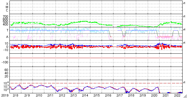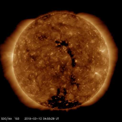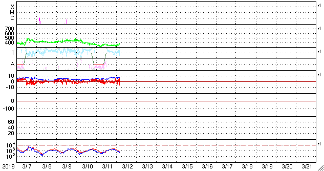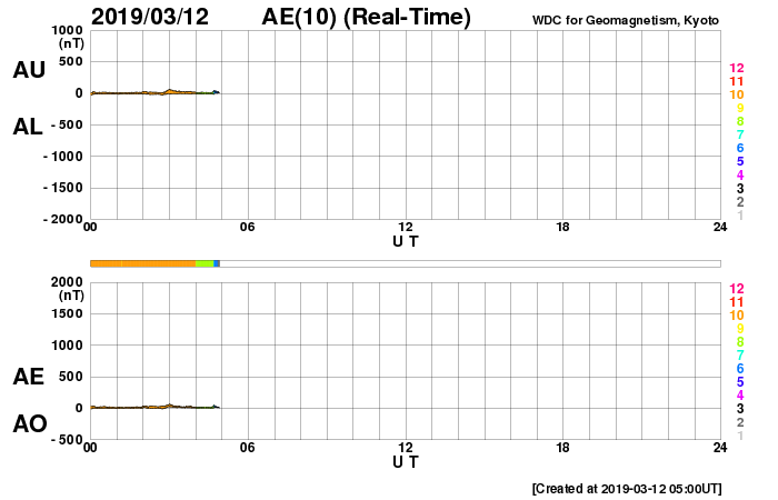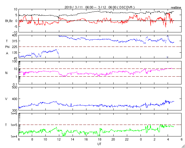 2019/ 3/12 14:10 更新 太陽風は低速で、磁気圏も穏やかです。 担当 篠原 太陽風の速度は、340km/秒と低速の状態が続き、 グラフの最後で370km/秒に少し上がった程度です。 磁場強度は、5nTから7nTヘ少し強まっています。 磁場の南北成分は、0nT付近で小さく変化しています。 磁気圏は穏やかな状態が続き、 AE指数は300nTの小さい変化が1度起きている程度です。 27日周期の図では、 前周期の太陽風はこの後500km/秒へゆっくりと上昇しています。 今回はどの様に推移するでしょうか。 昨日紹介した縦に伸びるコロナホールは、 まだ、太陽の中心線を通り過ぎた程度です。 太陽は穏やかで、 2734黒点群は小さくなり、西の端に近付いています。