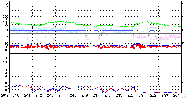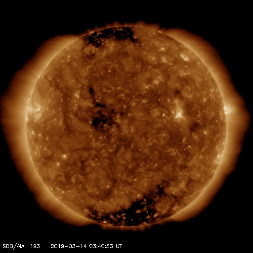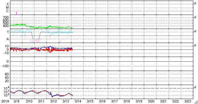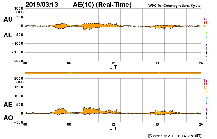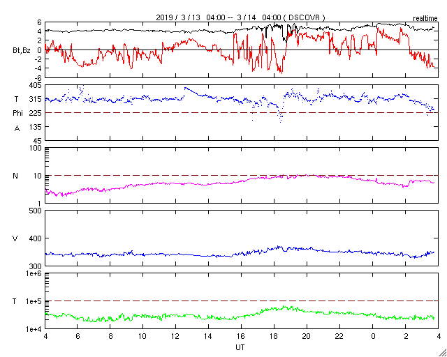 2019/ 3/14 12:58 更新 太陽風は低速の風が続いています。新しい黒点が出現しています。 担当 篠原 太陽風は、350km/秒前後の低速の状態が続いています。 磁場強度は、4〜5nTと平均的な値で安定しています。 太陽風は穏やかな状態が続いています。 磁場の南北成分は、振れ幅はあまり大きくありませんが、 南北にはっきりと変化している印象です。 このため、小規模ですが磁気圏の活動も発生して、 AE指数は300nT程度の変化が数回発生しています。 SDO衛星AIA193では、 コロナホールが西に進み、 写真でははっきり見えなくなっていますが、 地球へ影響が及び始める目安の位置に近付いています。 この後、太陽風に高まりが見られるかもしれません。 太陽では、西側(右側)の低緯度域に小さい黒点が現れています。 磁場の並びは現在の第24期の順番です。 更に大きくなるでしょうか。