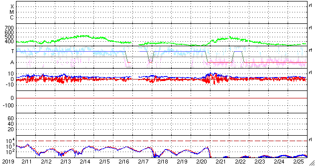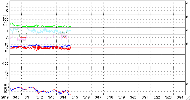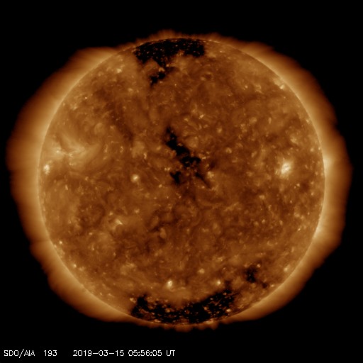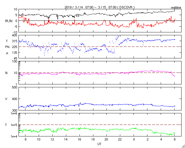 2019/ 3/15 15:11 更新 低速の太陽風が続いています。太陽は無黒点です。 担当 篠原 太陽風は、330〜350km/秒と低速の風が続いています。 磁場強度は、今日に入った頃からゆっくりと上昇して、 現在は8nTとやや強まっています。 この後、速度の変化も見られるでしょうか。 磁場の南北成分は、弱い南寄りになっています。 このため、磁気圏もやや活動的になっていて、 AE指数のグラフは、 300〜500nTの小規模の変化が続いています。 SDO衛星AIA193では、 太陽の中心部にコロナホールが見えています。 この影響が、3〜4日後くらいに 地球に到来する可能性があります。 27日周期の図では、前周期の変化は2月21日に始まっていて、 5日後くらいになっています。 今回はどの様な変化になるでしょうか。 太陽は、昨日見えていた小さい黒点は消えて、 無黒点に戻っています。 ![]() SDO衛星のAIA193カメラによる太陽コロナの様子 (c) SDO (NASA) ![]() SDO衛星による太陽の可視光写真 (c) SDO (NASA) ![]() DSCOVRが観測した太陽風の磁場(1番上の枠、黒線は全体の強度、赤線は南北成分) および、太陽風の密度(3番目の紫線)、速度(4番目の青線) (c) データ:NOAA/SWPC、作図:宇宙天気ニュース ![]() AE指数(速報値) 下段のAEグラフの値が高くなると、オーロラ活動が活発化しています。 (c) 京都大学WDC ![]() ![]() 27日の太陽周期に合わせたデータプロット 太陽が同じ面を地球に向けていた27日前の変化から、今後を予想することができます。 (c) 作図:宇宙天気ニュース
