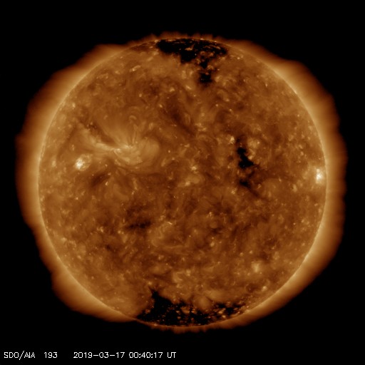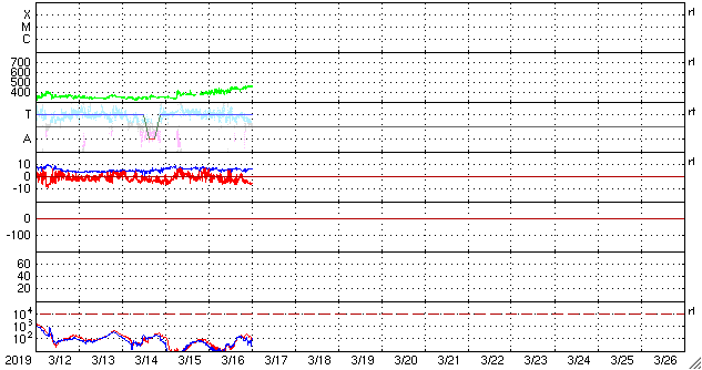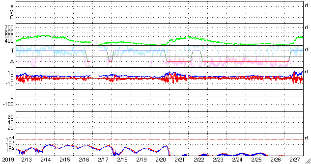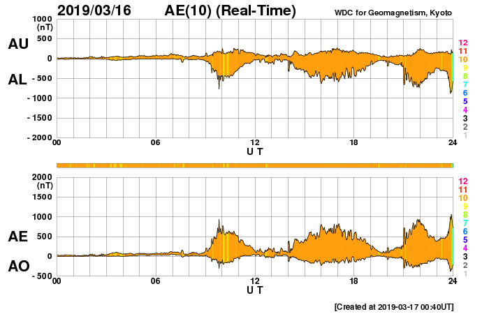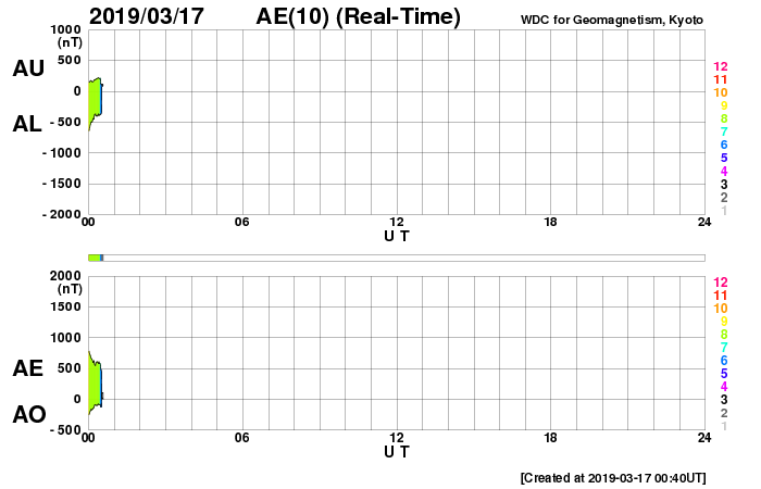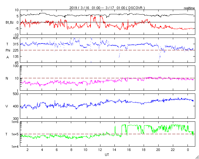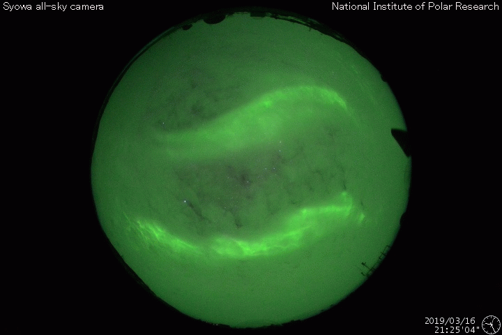 2019/ 3/17 09:54 更新 太陽風の磁場が南寄りになり、磁気圏の活動が高まっています。 担当 篠原 太陽風の速度は、400km/秒から450km/秒へゆっくり上がり、 やや高速になっています。 磁場強度は、5〜6nTと平均的な状態です。 磁場の南北成分は、昨日の夕方から南向きの傾向になり、 -5nT程度の南向きが続く様になっています。 このため磁気圏の活動も高まって、 AE指数では700〜1000nTの中規模の活動が、 連続する様に発生しています。 世界時16日21時半のオーロラの様子を、 南極の昭和基地の全天カメラの動画で紹介します。 AE指数が900nTに高まった頃の活動です。 昭和基地の全天カメラの撮影が再開され、 オーロラの季節は北半球から南半球へ移っていきます。 この後も、太陽風磁場の南寄りの傾向が続けば、 磁気圏の活動も高まった状態が続くでしょう。 また、速度はどの様に推移するでしょうか。 太陽は、無黒点で穏やかな状態が続いています。
