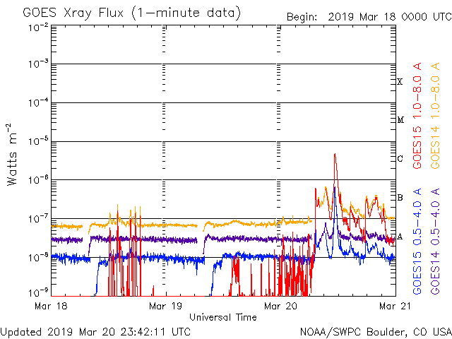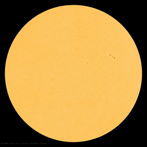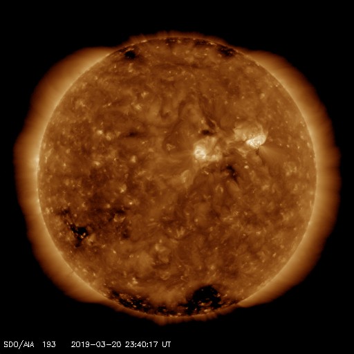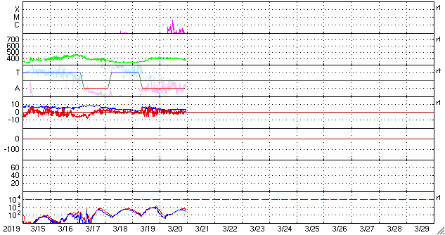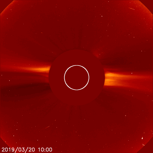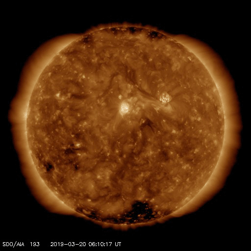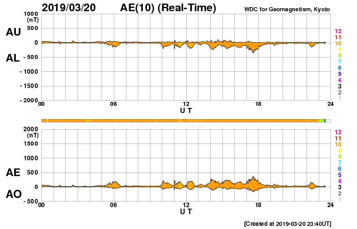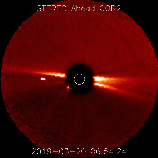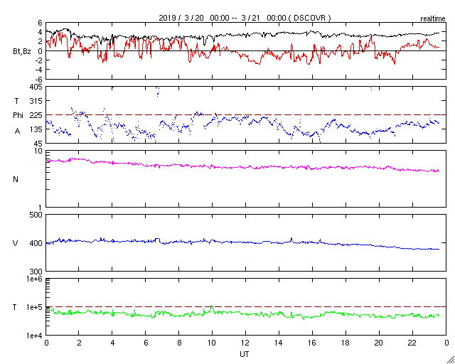 2019/ 3/21 08:47 更新 C4.8の小規模フレアが発生し、CMEも発生しています。 担当 篠原 太陽の西側に新しく現れた黒点で、 昨夜、20日19時半(世界時20日10時半)に、 C4.8の小規模フレアが発生しました。 フレアの様子を、SDO衛星AIA193、131の動画で紹介します。 このフレアに伴って、CME(太陽ガスの放出現象)も発生しています。 SOHO衛星LASCO C2、C3では、 淡いガスが太陽の右側を中心に飛び出して行く様子が見えています。 また、太陽を横から観測しているSTEREO Ahead衛星でも、 CMEが太陽から横方向に飛び出して行く様子が捉えられています。 真正面という状況ではありませんが、 飛び出したガスは地球にも向かっている可能性があります。 フレアの規模から考えると、大きな乱れにはならないと思いますが、 3〜4日後くらいに太陽風の乱れが到来する可能性があります。 太陽の可視光写真では、黒点は昨日よりも大きくなっています。 この後も、フレアを起こすかもしれません。 太陽風は、速度が400km/秒から380km/秒へ少し下がり、 やや低速になっています。 磁場強度は、3〜4nTとやや弱い状態です。 磁気圏は概ね静穏ですが、 AE指数には、小規模の変化も発生しています。 週末に学内で停電を伴う工事があり、ネットワークが停止します。 そのため、今日から来週の月曜日にかけて外部サーバーで運用を行います。 ニュースの更新は続けますが、フレア速報や最新情報の更新は停止します。 ご了解下さい。 ![]() C4.8の小規模フレアの様子。SDO衛星AIA193、131。 (c) SDO (NASA)、(動画加工 : 宇宙天気ニュース) ![]() 太陽の右寄りに噴出するCME。SOHO衛星LASCO C2、C3。 (c) SOHO (ESA & NASA)、 (動画加工 : 宇宙天気ニュース) ![]() STEREO Ahead衛星により、太陽の横から撮影したCME。 (c) STEREO (NASA)、 (動画加工 : 宇宙天気ニュース) ![]() SDO衛星のAIA193カメラによる太陽コロナの様子 (c) SDO (NASA) ![]() SDO衛星による太陽の可視光写真。マウスの矢印を写真に重ねると、黒点番号付きの写真に切り替わります。 (c) SDO (NASA) ![]() GOES衛星の太陽X線データ (c) NOAA/SWPC ![]() DSCOVRが観測した太陽風の磁場(1番上の枠、黒線は全体の強度、赤線は南北成分) および、太陽風の密度(3番目の紫線)、速度(4番目の青線) (c) データ:NOAA/SWPC、作図:宇宙天気ニュース ![]() AE指数(速報値) 下段のAEグラフの値が高くなると、オーロラ活動が活発化しています。 (c) 京都大学WDC ![]() 27日の太陽周期に合わせたデータプロット 太陽が同じ面を地球に向けていた27日前の変化から、今後を予想することができます。 (c) 作図:宇宙天気ニュース