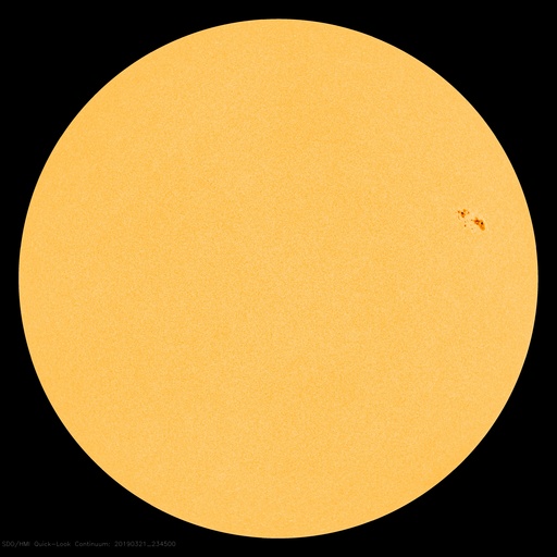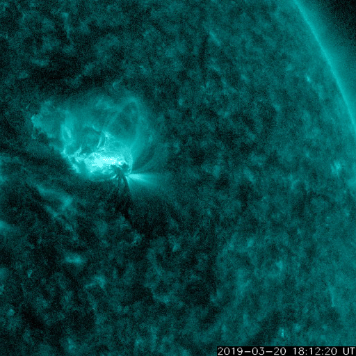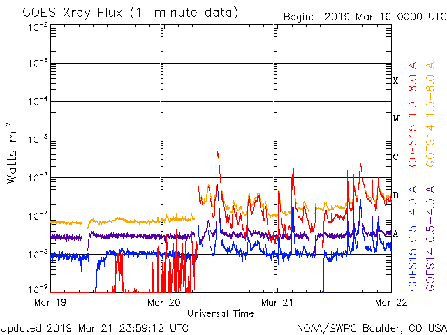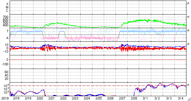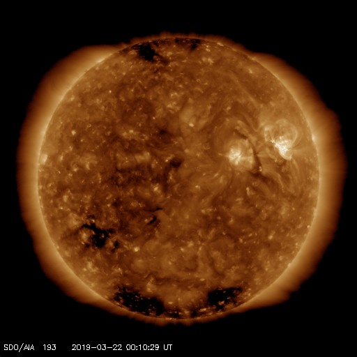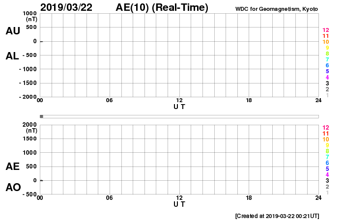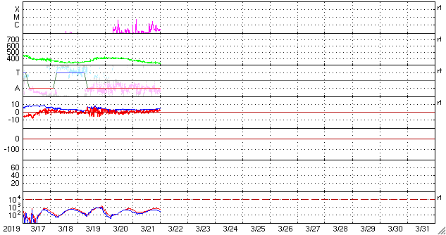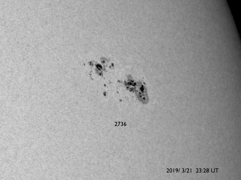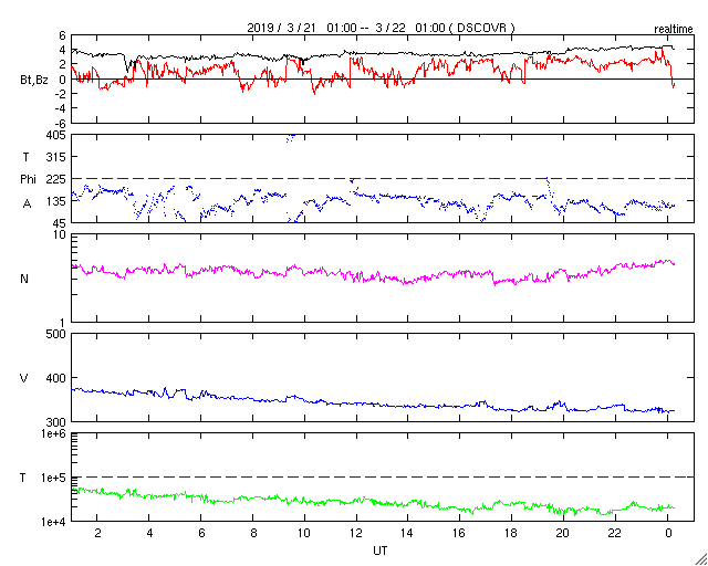 2019/ 3/22 09:28 更新 C5.3など小規模フレアの発生が続いています。 担当 篠原 一昨日の夜にC4.8のフレアを起こした黒点は、 2736黒点群と番号が付けられ、 その後もCクラスのフレアを起こし続けています。 昨日の昼、21日12時(世界時21日3時)にC5.6、 今日未明の22日2時(世界時21日17時)にC2.6が発生し、 その他にもC1のフレアを3回起こしています。 活発な活動の様子を、SDO衛星AIA131の動画で紹介します。 可視光写真で見ると、黒点は昨日よりも大きくなっています。 太陽の西の端に近付いてきたので、 地球へ影響が及ぶ可能性は次第に小さくなっていますが、 引き続き注目して下さい。 一方、2735黒点群は現在の写真では見えなくなっています。 太陽風は、速度が320km/秒へ下がり、 一段と低速の風になっています。 磁場強度は3〜4nTとやや弱い状態です。 磁場の南北成分は、弱い北寄りになっています。 速度が下がっていることもあって、磁気圏は穏やかで、 AE指数はほとんど変化が見られません。 SDO衛星AIA193の太陽写真の中央部にコロナホールは見られず、 太陽風は基本的には穏やかな風が続きそうです。 しかし、昨日お知らせしたCMEによる乱れが 地球に向かっている可能性があり、 明日の夜以降は変化に注目してください。