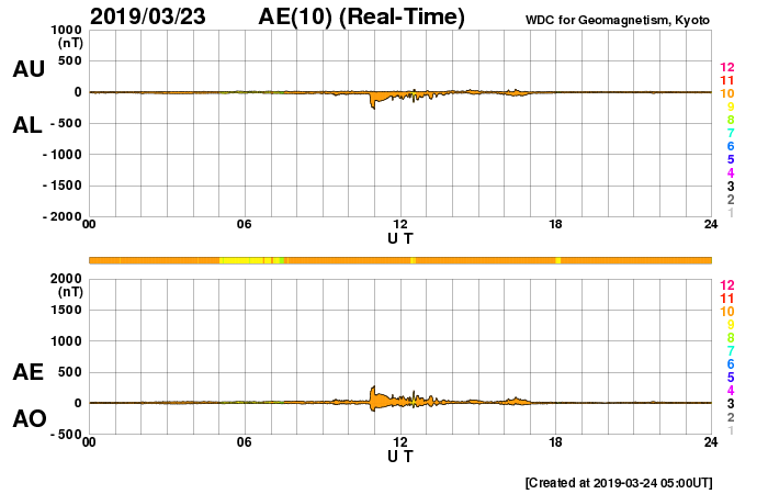 下段のAEグラフの値が高くなると、オーロラ活動が活発化しています。