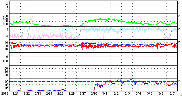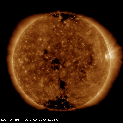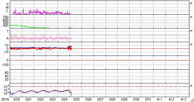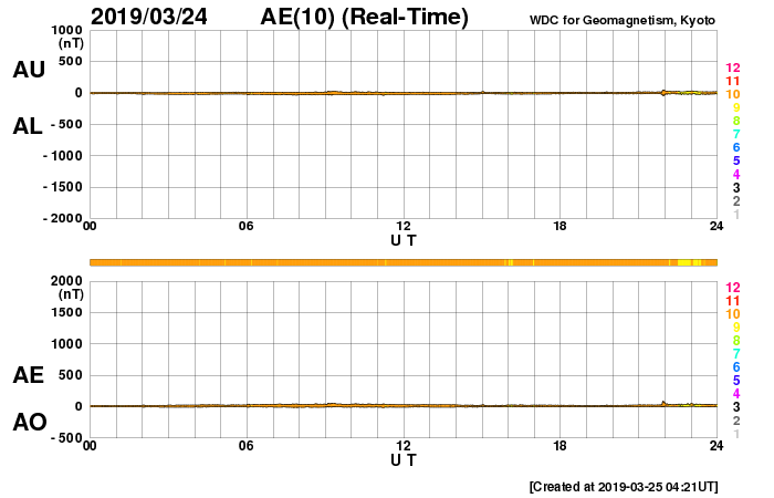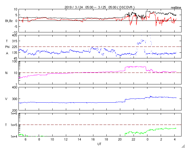 2019/ 3/25 13:22 更新 太陽風に小さい変化が発生しています。太陽は無黒点になっています。 担当 篠原 今朝、25日6時(世界時24日21時)頃に、 小幅ですが、太陽風の速度、磁場強度、密度などが 急に強まる変化が発生しています。 20日のCME(太陽ガスの放出現象)の乱れが、 4日半ほどかかって地球へやって来た様です。 速度は、270km/秒から300km/秒へ、 磁場強度は、3nTから7〜8nTへ高まった程度で、 磁場の南北成分も北向きに強まったため、 磁気圏への影響は小さく、 AE指数では、特に変化は発生していません。 その後も太陽風は低速の穏やかな状態が続き、 磁気圏もとても静かです。 太陽は、2736黒点群が沈んで、 無黒点になっています。 X線グラフでは、黒点群が沈む直前に、 B9.6ともう少しでCクラスに達する小さいフレアが発生しています。 この後は、X線グラフの強度も下がって行くでしょう。 ![]() SDO衛星のAIA193カメラによる太陽コロナの様子 (c) SDO (NASA) ![]() SDO衛星による太陽の可視光写真 (c) SDO (NASA) ![]() DSCOVRが観測した太陽風の磁場(1番上の枠、黒線は全体の強度、赤線は南北成分) および、太陽風の密度(3番目の紫線)、速度(4番目の青線) (c) データ:NOAA/SWPC、作図:宇宙天気ニュース ![]() AE指数(速報値) 下段のAEグラフの値が高くなると、オーロラ活動が活発化しています。 (c) 京都大学WDC ![]() ![]() 27日の太陽周期に合わせたデータプロット 太陽が同じ面を地球に向けていた27日前の変化から、今後を予想することができます。 (c) 作図:宇宙天気ニュース