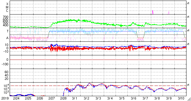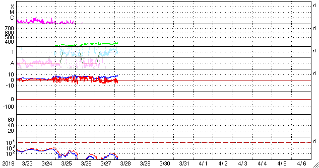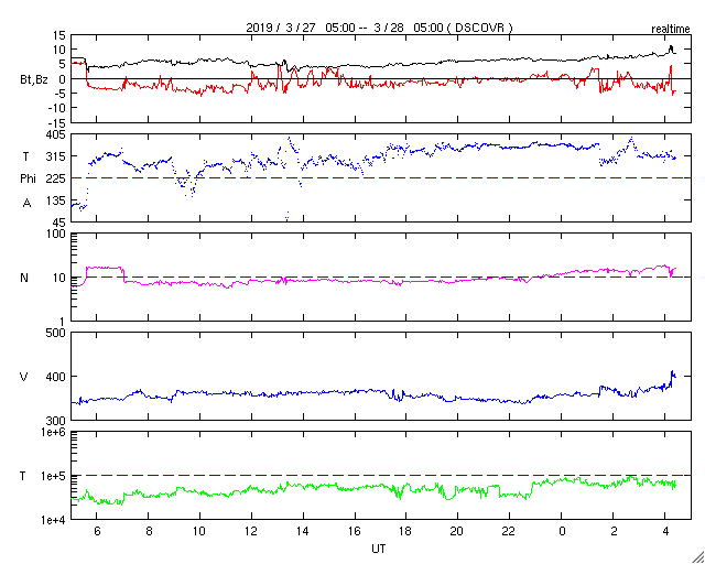 - 2019/ 3/27 13:09 低速の太陽風が続き、磁気圏も穏やかです。