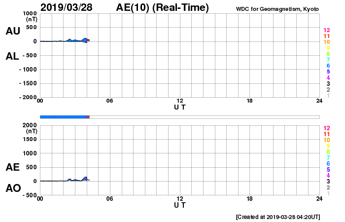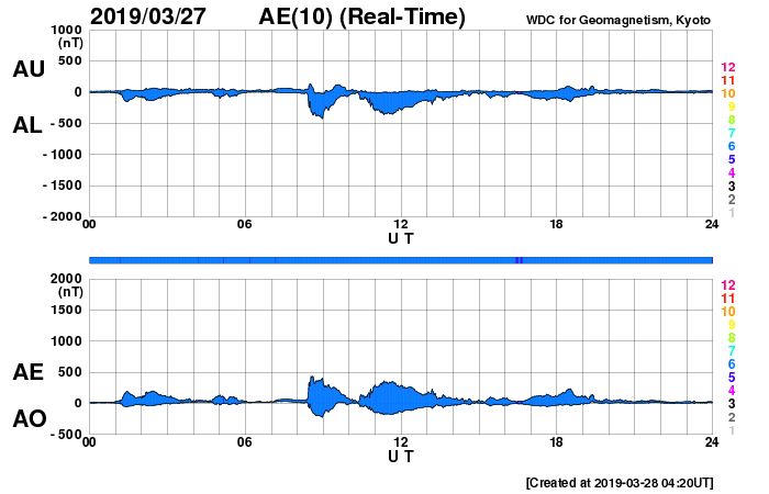 下段のAEグラフの値が高くなると、オーロラ活動が活発化しています。