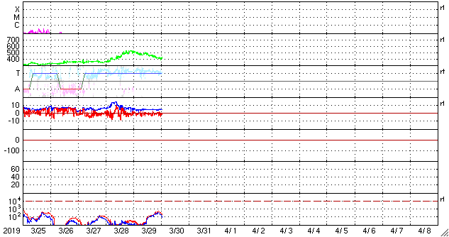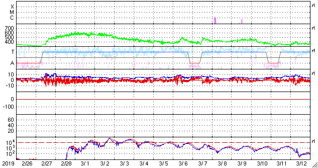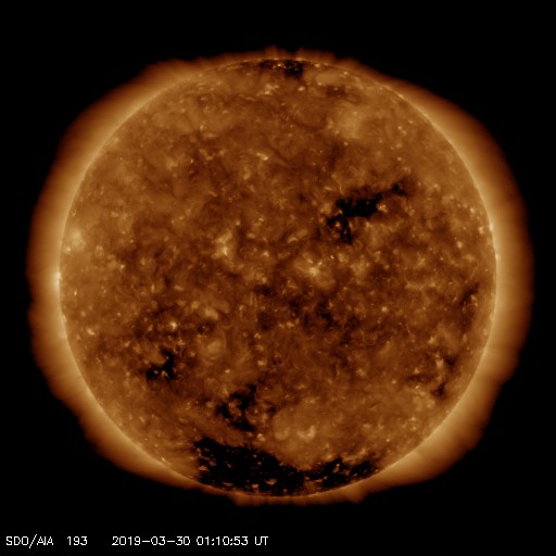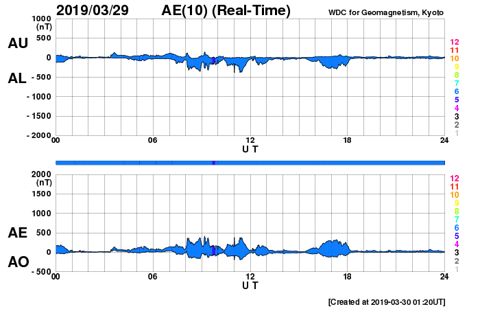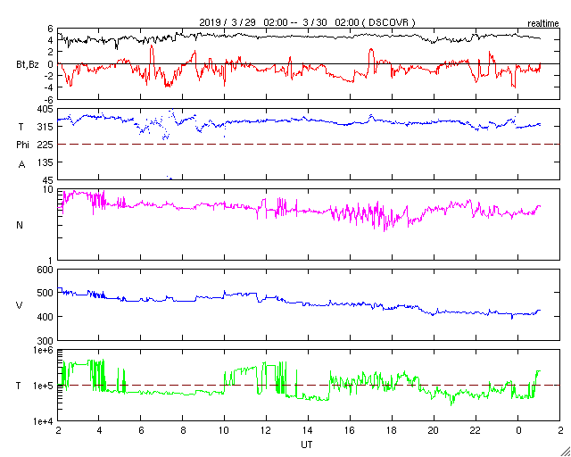 2019/ 3/30 10:17 更新 太陽風は平均的な速度に戻っています。 担当 篠原 太陽風の速度の高まりは、 昨日のニュースの頃が最高だった様で、 以降はゆっくりと下がって行って、 現在は400km/秒と平均的な状態に戻っています。 高速風は1日程度で終わってしまいました。 27日周期の図で前周期の変化と比べると、 最高速度も継続期間もずいぶん小規模になってしまいました。 太陽風の磁場強度は、4〜5nTと平均的な値で推移しています。 南北成分は弱い南寄りになっています。 このため、磁気圏では小規模の活動が起きていて、 AE指数は300nTくらいの変化が続いています。 現在は、太陽風の速度が下がってしまったので、 今後の磁気圏の活動は小さくなって行きそうです。 SDO衛星AIA193の太陽コロナ写真では、 小さいコロナホールが所々に見えている程度です。 この後の太陽風は、穏やかに推移しそうです。 太陽は、無黒点で穏やかです。 ![]() SDO衛星のAIA193カメラによる太陽コロナの様子 (c) SDO (NASA) ![]() SDO衛星による太陽の可視光写真 (c) SDO (NASA) ![]() DSCOVRが観測した太陽風の磁場(1番上の枠、黒線は全体の強度、赤線は南北成分) および、太陽風の密度(3番目の紫線)、速度(4番目の青線) (c) データ:NOAA/SWPC、作図:宇宙天気ニュース ![]() AE指数(速報値) 下段のAEグラフの値が高くなると、オーロラ活動が活発化しています。 (c) 京都大学WDC ![]() ![]() 27日の太陽周期に合わせたデータプロット 太陽が同じ面を地球に向けていた27日前の変化から、今後を予想することができます。 (c) 作図:宇宙天気ニュース