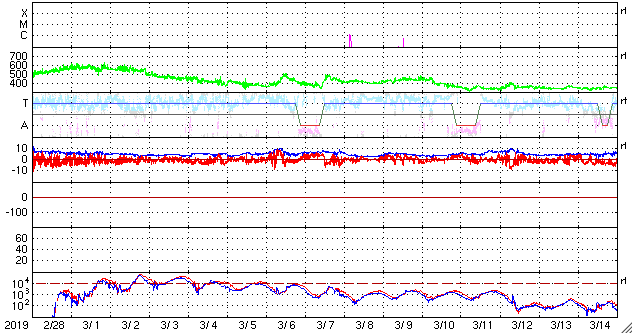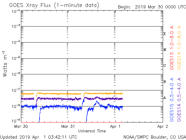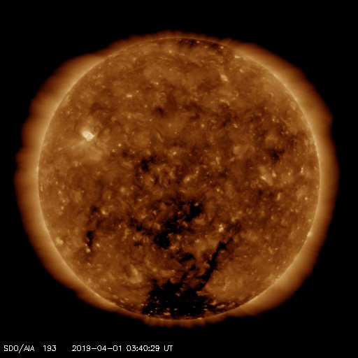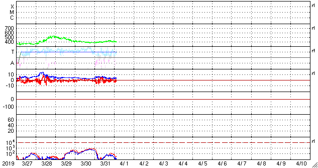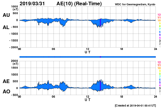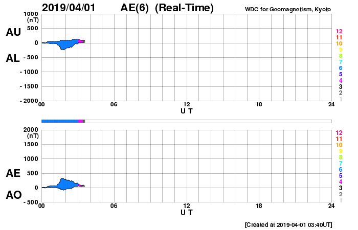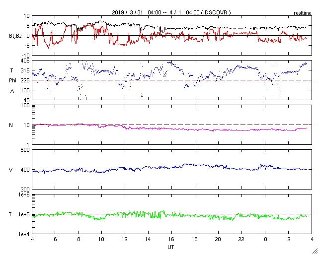 2019/ 4/ 1 12:48 更新 太陽に新しい黒点が出現しています。太陽風は平均的な状態です。 担当 篠原 太陽の北東側(左上)に新しい黒点が発生し、 2737群と番号が付けられています。 SDO衛星の写真では、昨夜くらいから黒点が見え始めています。 磁場の並びは現在の第24活動周期の順番で、 出現緯度も北緯12度と低緯度寄りです。 X線グラフに特に変化はなく、 今のところ活動は静かです。 太陽風は、速度が400km/秒、磁場強度は4〜5nTと、 どちらも平均的な状態です。 磁場の南北成分は、 南に向いたり、北に向いたりしています。 こんため磁気圏の活動も少し高まって、 AE指数では、500nTに達する中規模の変化が数回発生しています。 SDO衛星の太陽コロナ写真では、 中央部の南半球側に、コロナホールが淡く見えています。 3日後くらいにこの領域の影響が見られるでしょうか。