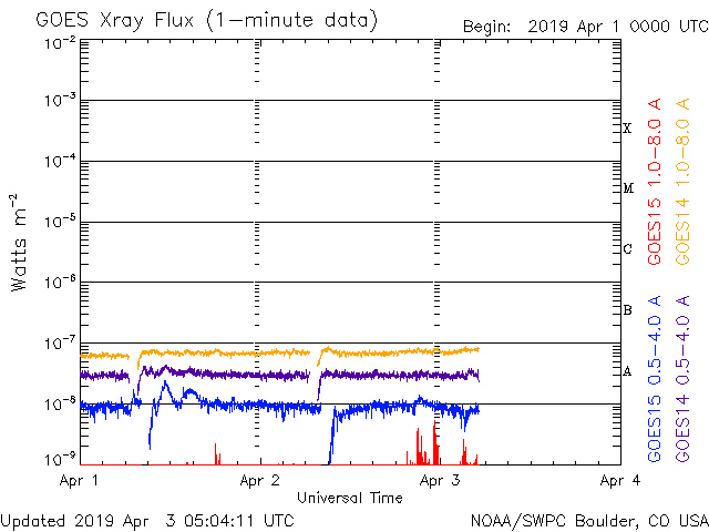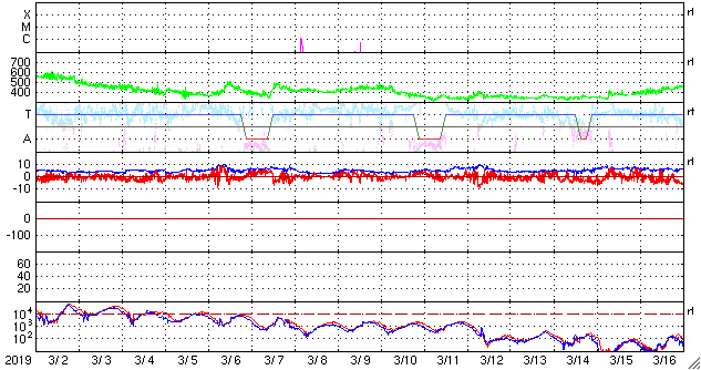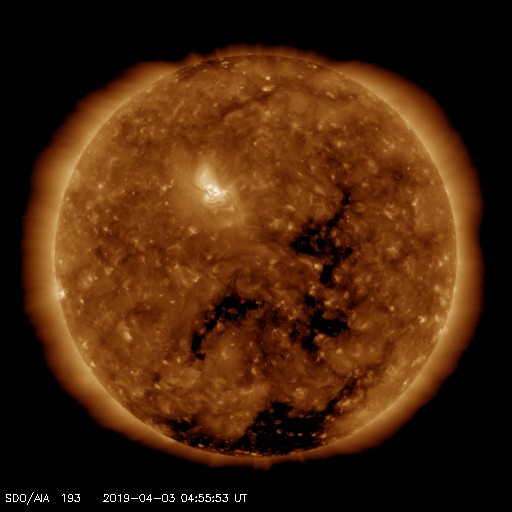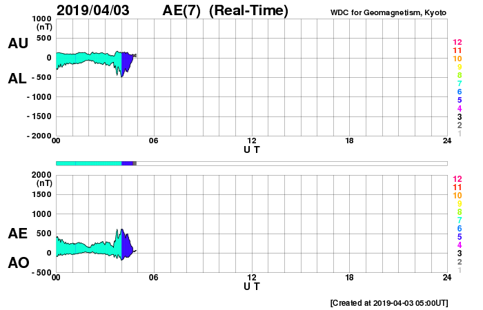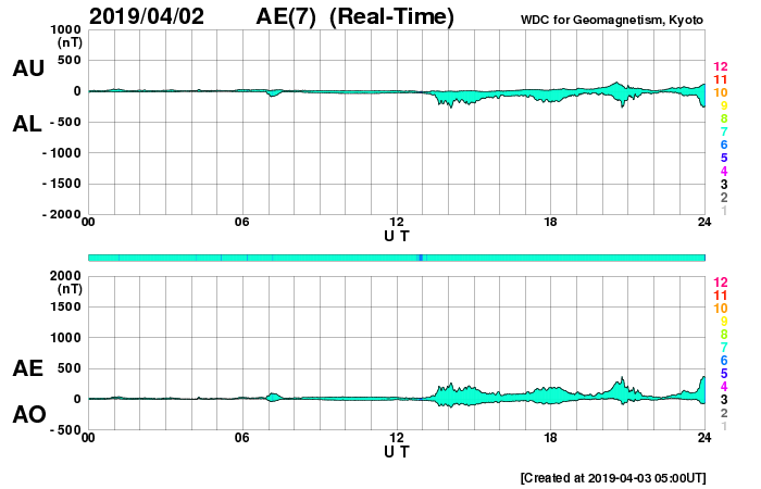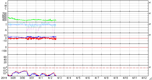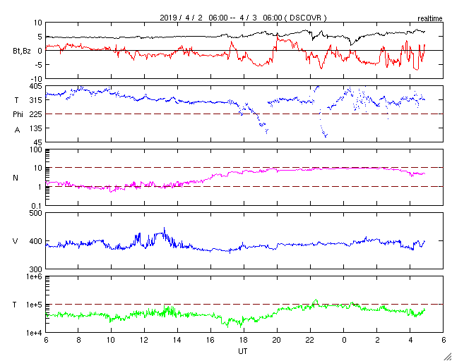 2019/ 4/ 3 14:10 更新 太陽風磁場が南寄りになり、磁気圏の活動が少し高まっています。 担当 篠原 2737黒点群は、多少形を変えていますが、 昨日と同じくらいの見え方になっています。 X線グラフは、小さい値の変化が見える様になっていますが、 活動に特に変化は見られません。 太陽は穏やかな状態です。 太陽風は、380〜400km/秒と平均的な速度が続いています。 磁場強度は、5nTから7nTへ少し上がっています。 磁場の南北成分は、 グラフの後半から南向きに変化する傾向になっています。 これを受けて、AE指数も200〜500nTと小規模の変化が 続くようになっています。 SDO衛星AIA193の南半球のコロナホールは、 影響が始まる目安の位置に近付いています。 この後、速度の高まりが見られるでしょうか。 今日は入学式でした。 晴天と満開少し前の桜に恵まれ、 気持ちの良い日になっています。