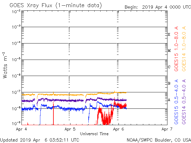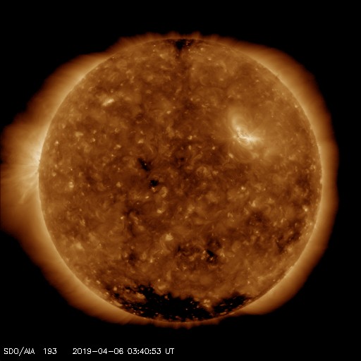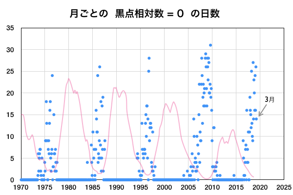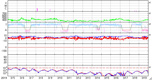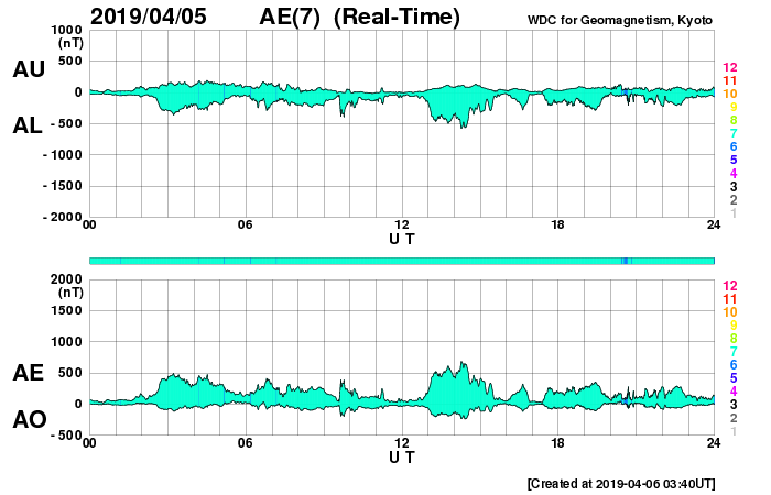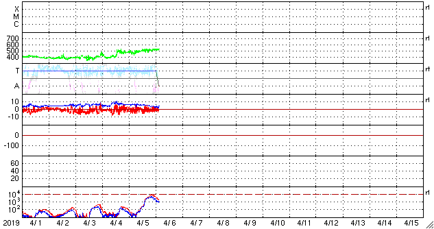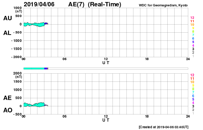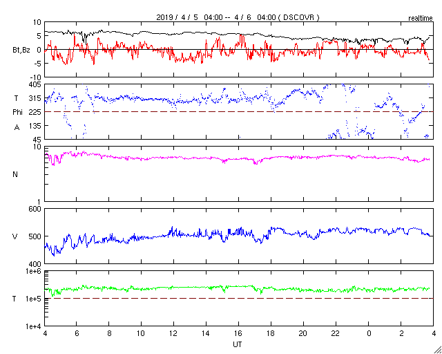 2019/ 4/ 6 12:56 更新 高速の太陽風が続いています。3月の黒点相対数は 9.5 でした。 担当 篠原 WDC-SILSOより、 3月の黒点相対数の月平均値は、 9.5 と発表されました。 3月は、上旬に小さいですが2734黒点群が現れ、 下旬にはC5.6のフレアを起こした2736群が現れるなどして、 月の半分は黒点が見えていました(無黒点日は14日)。 それでも、平均値が10を割る状態は続いていて、 2018年7月以降、9か月連続で1桁台に留まっています。 現在の太陽は、2737黒点群が見えていた領域に、 小さい黒点が現れたり消えたりしています。 SDO衛星AIA193の写真では、 東端(左端)の向こう側が明るくなっています。 3月下旬にフレアを起こした2736群の領域が 太陽の向こう側を回ってきた様です。 現在の活動度はどうなっているでしょうか。 太陽風は、速度が520km/秒に高まっています。 コロナホールの影響は強まっています。 一方、磁場強度は、6nTから3nTへゆっくりと下がっています。 磁気圏では小規模の活動が続いていて、 AE指数は200〜500nTの変化が連続的に発生しています。 今日のSDO衛星AIA193の写真では、 太陽の中央線付近にコロナホールは見えていません。 太陽風の高まりは次第に下がって行きそうです。
