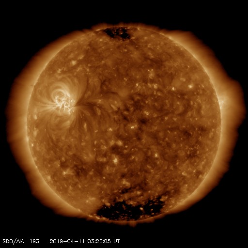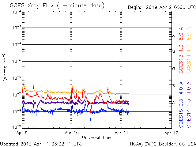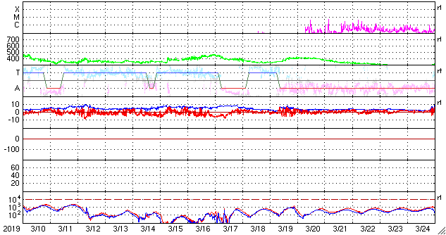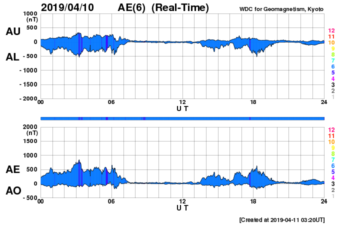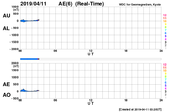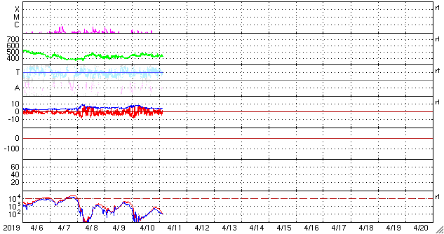 2019/ 4/11 12:39 更新 太陽風は400km/秒台で安定しています。2738黒点群は大きな姿を保っています。 担当 篠原 太陽風の速度は、 430km/秒から470km/秒に少し上がって、 再び430km/秒に戻るという小幅の変化をしています。 磁場強度は、8nTから5nTに下がって、 平均的な状態です。 磁場の南北成分は、 0nTを挟んで、南北両方に変化しています。 振れ幅は次第に小さくなっていて、 AE指数では500nT前後の変化が発生していますが、 変化は次第に小さくなっている様です。 太陽風は安定した状態が続いています。 SDO衛星AIA193の太陽写真にはコロナホールはなく、 太陽風はこの後も穏やかに推移しそうです。 太陽は、2738黒点群が大きな姿を保っています。 X線グラフは、Bクラスの小さい変化が時々発生していて、 活動度に変化は見られません。 この後どの様に推移するのか、引き続き注目してください。