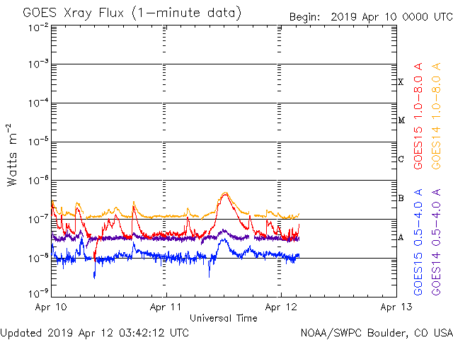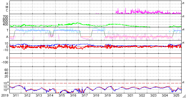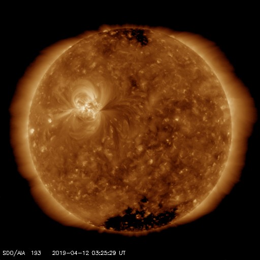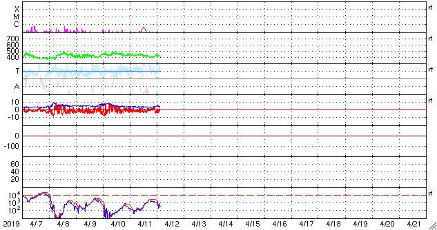 - 2019/ 4/ 7 12:59 太陽風の速度は400km/秒近くに下がっています。